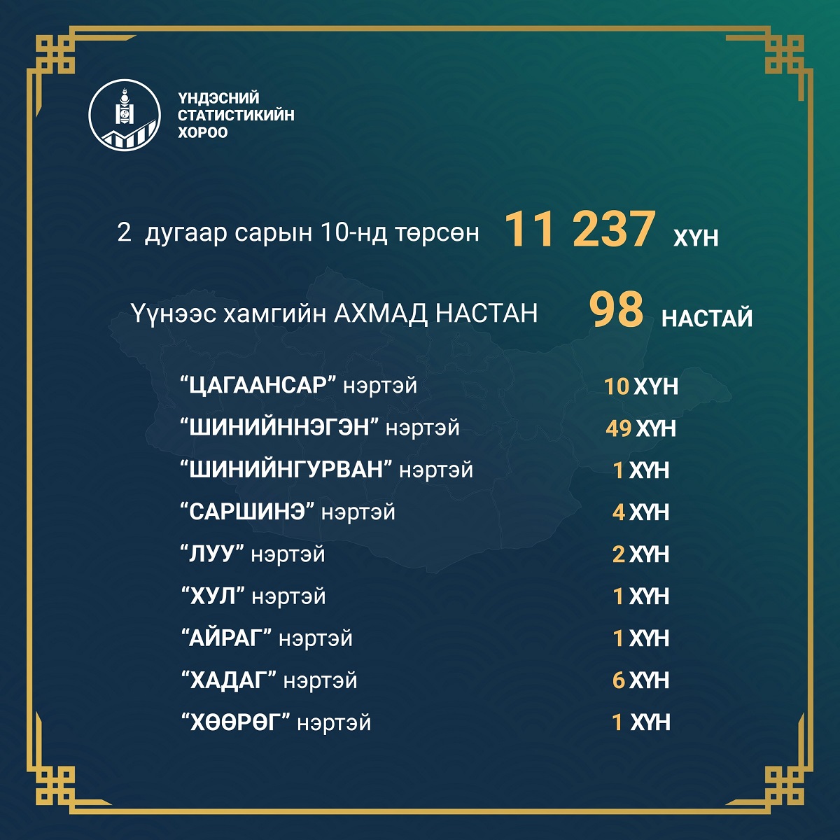 Энэ жилийн Шинийн нэгэн буюу хоёрдугаар сарын 10-ны өдөр төрсөн 11237 хүн байгаа бөгөөд хамгийн өндөр настай нь 98 настай ахмад байна. Үүнээс хамгийн ахмад нь 98 настай.