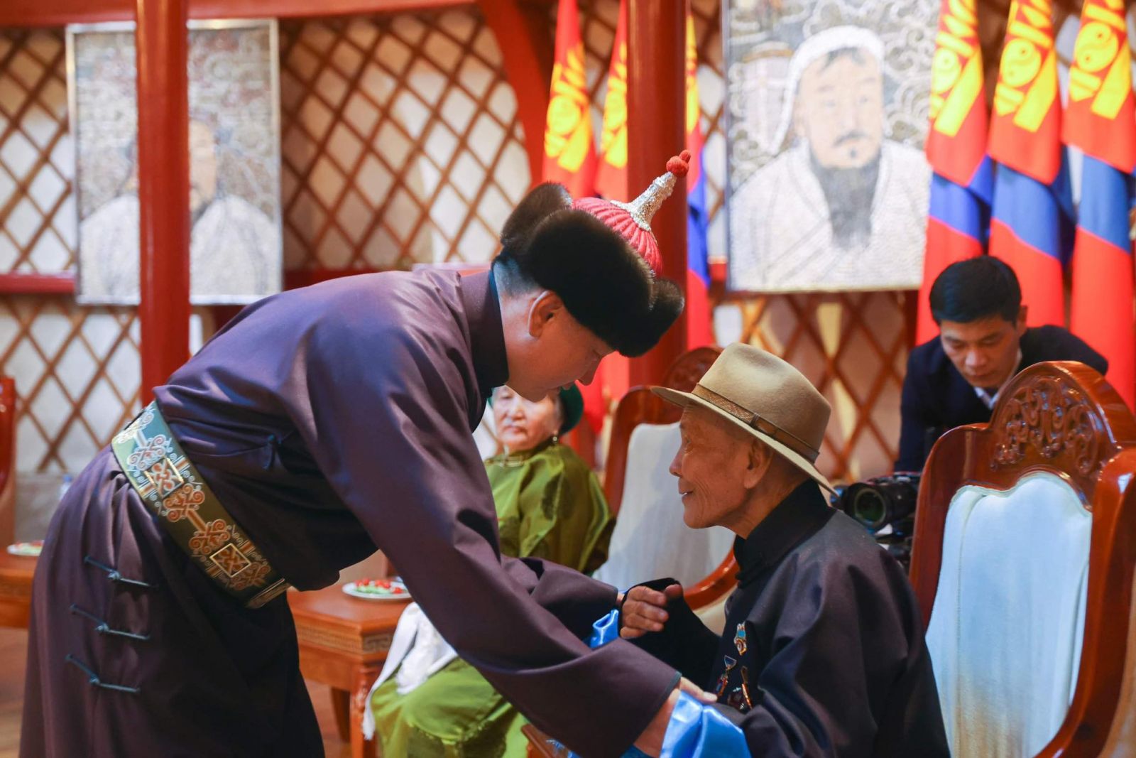 Төрийн ордонд нийгмийн зүтгэлтэн, Алдарт эх, соёл урлаг, газар тариалан, мал аж ахуй, батлан хамгаалах, боловсролын салбарыг төлөөлсөн 80-95 настай азай буурлууд хүрэлцэн иржээ.