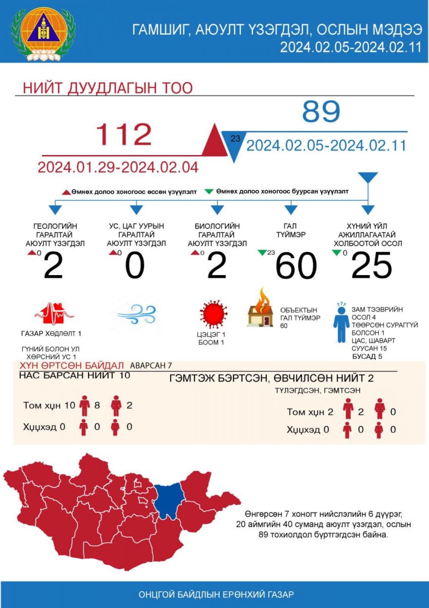 Улсын хэмжээнд өнгөрсөн долоо хоногт /2024.02.05-02.11/нийслэлийн 6 дүүрэг, 20 аймгийн 40 суманд аюулт үзэгдэл, ослын 89 удаагийн дуудлага бүртгэгдлээ.