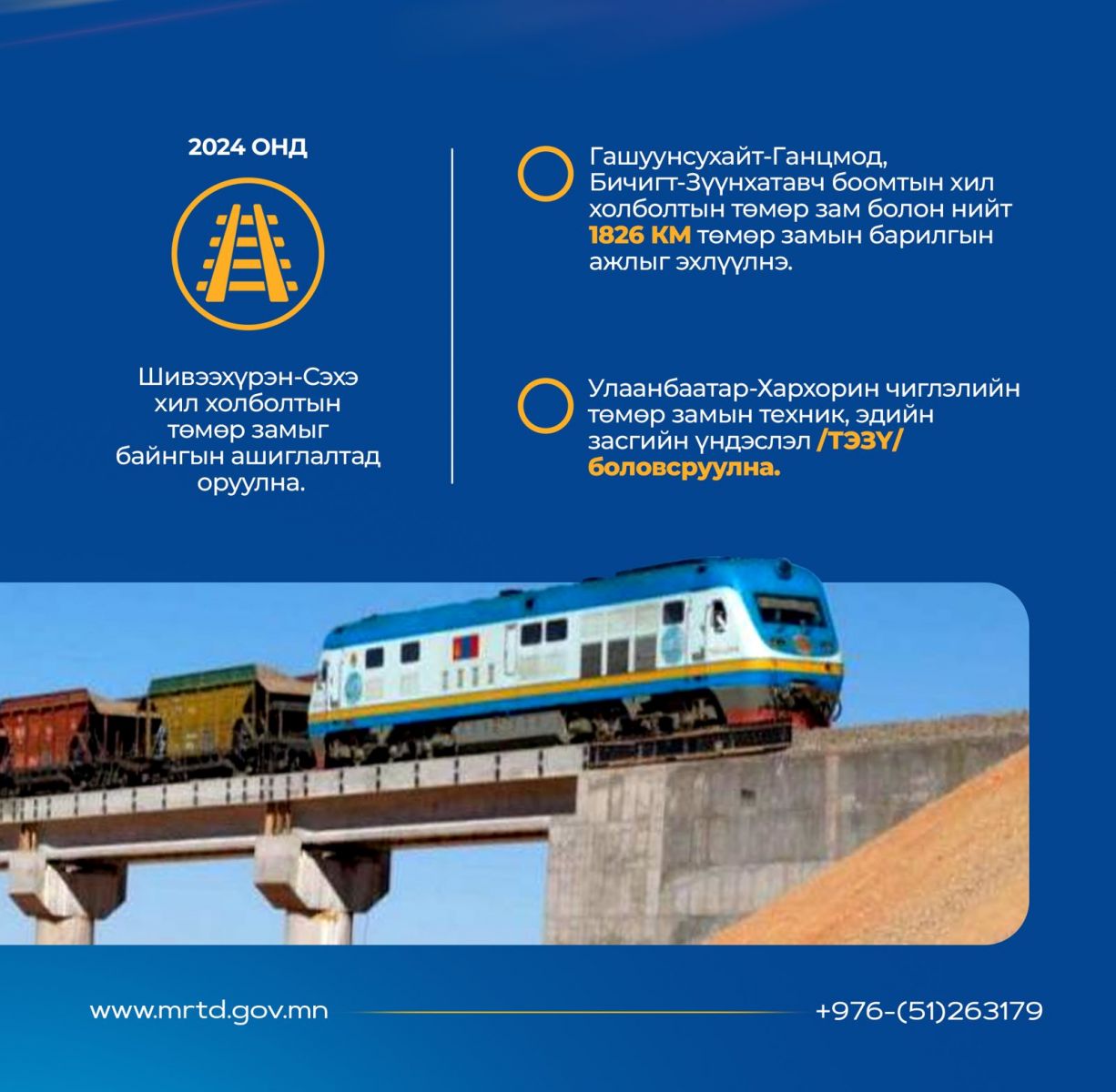 Төмөр замын салбарт энэ онд 2.5 сая зорчигч, 45.5 сая.тонн ачаа тээвэрлэхээр төлөвлөөд байна. Зүүнбаян-Ханги чиглэлийн 227 км, Шивээхүрэн-Сэхэ чиглэлийн хил холболтын төмөр замыг байнгын ашиглалтад оруулж, Гашуунсухайт-Ганцмод, Бичигт-Зүүнбаян боомтын хил холболтын төмөр зам болон нийт 1826 км төмөр замын барилгын ажлыг эхлүүлэх юм.