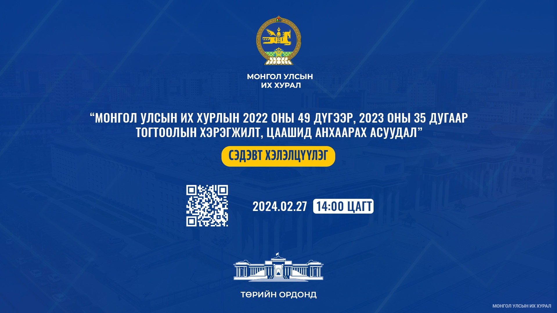 Монгол Улсын Их Хурлын Хууль зүйн байнгын хороо Хүний эрхийн Үндэсний Комисстой хамтран Монгол Улс дахь хүний эрх, эрх чөлөөний нөхцөл байдлын талаарх 21, 22 дахь илтгэлийг хэлэлцсэнтэй холбогдуулан авах арга хэмжээний тухай Улсын Их Хурлын 2022 оны 49 дүгээр, 2023 оны 35 дугаар тогтоолын хэрэгжилтийн талаарх хэлэлцүүлгийг 2024 оны 02 дугаар сарын 27-ны өдрийн 14.00 цагт Төрийн ордонд зохион байгуулна.