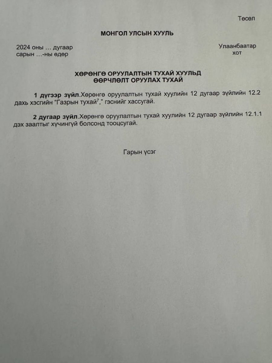 Газрыг 100 жилээр эзэмшүүлэх заалтыг хүчингүй болгох төсөлд санал авахаар ЗГ-т хүргүүллээ