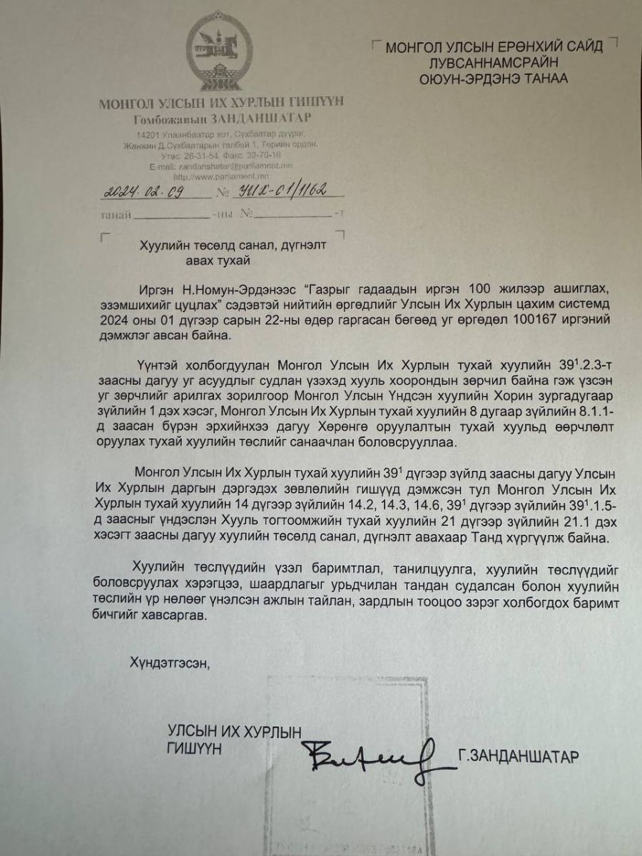 Иргэн Н.Оюун-Эрдэнээс "Газрыг гадаадын иргэн 100 жилээр ашиглах, эзэмшихийг цуцлах" сэдэвтэй нийтийн өргөдлийг УИХ-ын цахим системд 2024 оны нэгдүгээр сарын 22-ны өдөр гаргасан. Уг өргөдөл 100.167 иргэний дэмжлэг авсан байна.
