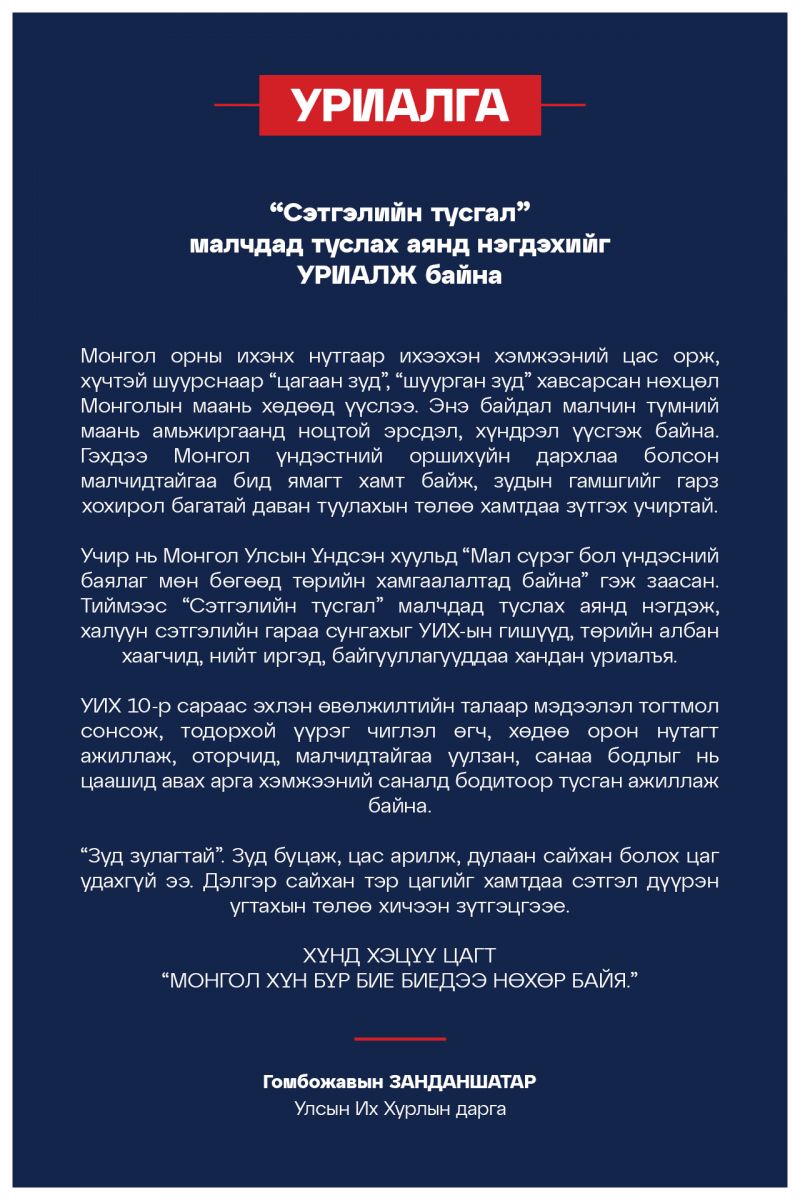 Учир нь Монгол Улсын Үндсэн хуульд “Мал сүрэг бол үндэсний баялаг мөн бөгөөд төрийн хамгаалалтад байна” гэж заасан. Тиймээс “Сэтгэлийн тусгал” малчдад туслах аянд нэгдэж, халуун сэтгэлийн гараа сунгахыг УИХ-ын гишүүд, төрийн албан хаагчид, нийт иргэд, байгууллагууддаа хандан уриалъя.