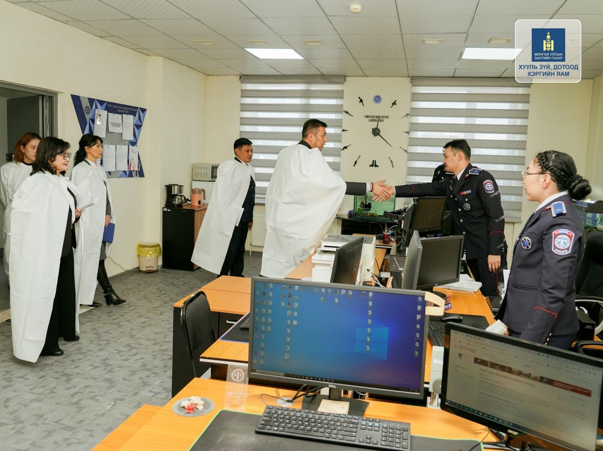 Хууль зүй, дотоод хэргийн сайд Б.Энхбаяр Шүүх шинжилгээний ерөнхий газарт өнөөдөр /2024.02.19/ ажиллаж, орчин үеийн дэвшилтэт шинжилгээний лабораториудын үйл ажиллагаатай танилцан, алба хаагчидтай уулзлаа.