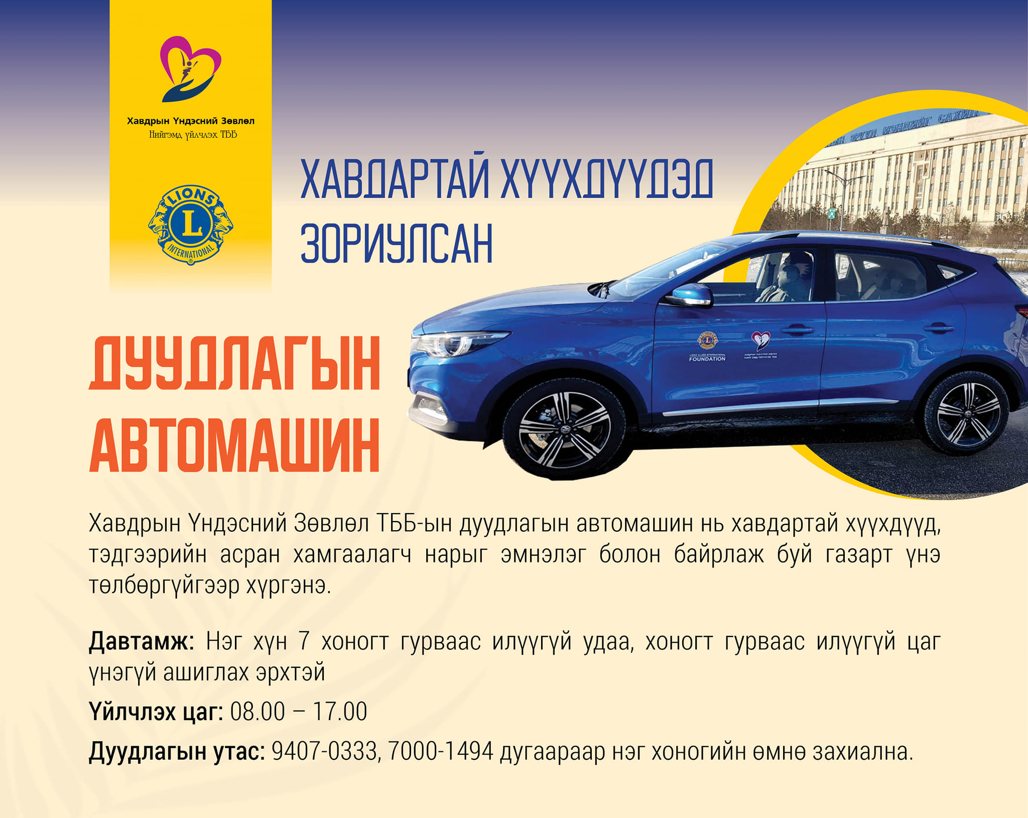 Хавдрын Үндэсний Зөвлөл ТББ-аас хавдартай хүүхдүүдэд зориула дуудлагын автомашин үйлчилгээнд явуулахаар болжээ. Тус машиныг хадвартай тэмцэж буй хүүхдүүд болон тэдгээрийн асран хамгаалагчид ашиглах боломжтой юм. Хэрэв та эмнэлэг эсвэл гэр рүүгээ хүргүүлэх бол нэг хоногийн өмнө мэдэгдэж, 9407-0333 дугаарт залгаж, дуудлага өгөөрэй.