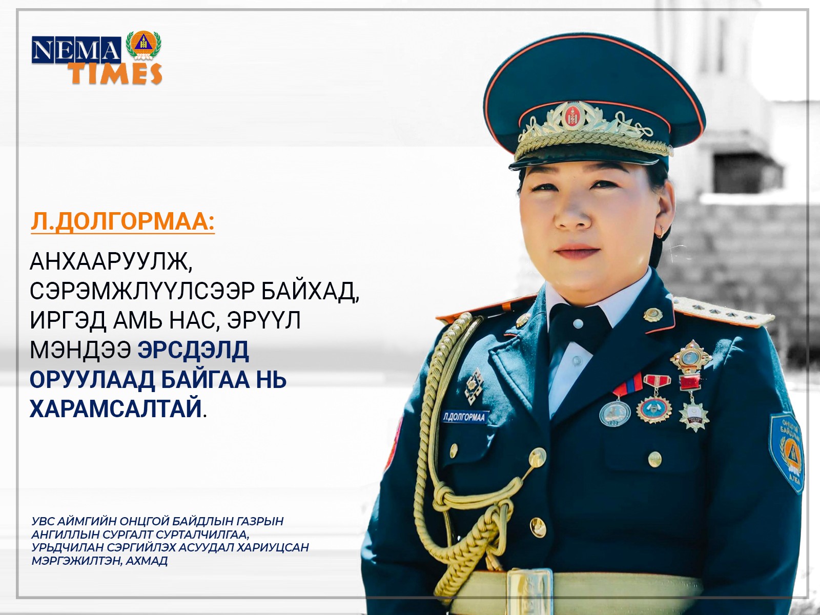 Эзэн хичээвэл заяа хичээнэ гэдэг үгийг тунхагаа болгон амьдралдаа мөрддөг тэрбээр “Цэргийн цол зүүсэн л бол эр, эм гэлгүй зарчимтай, элдэв тайлбар хэлэхгүйгээр албандаа зүтгэх ёстой” гэх чигч шулуун бодолтой. Түүнийг Лхагвын Долгормаа гэдэг.