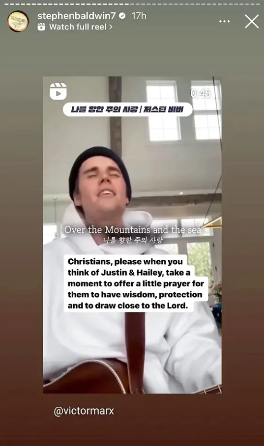 Загвар өмсөгч Хэйли Биберийн аав Стивен Болдуин охин болон хүргэнийхээ төлөө залбирч өгөхийг хүссэн утга бүхий бичвэр инстаграм хуудаснаа нийтэлсэн нь шүтэн бишрэгчдийнх нь санааг ихэд чилээжээ.