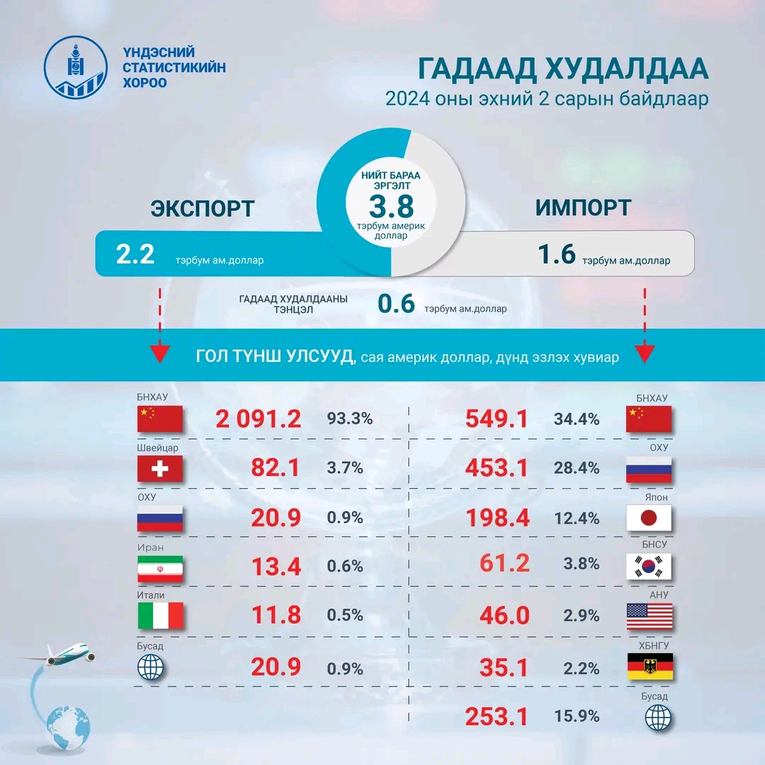 Монгол Улс 2024 оны эхний хоёр сард нийт 121 улстай худалдаа хийж, гадаад худалдааны нийт бараа эргэлт 3.8 тэрбум ам.долларт хүрчээ. Үүнээс экспорт 2.2 тэрбум ам.доллар, импорт 1.6 тэрбум ам.долларт хүрч, тэнцэл 644.4 сая ам.долларын ашигтай гарсан байна.