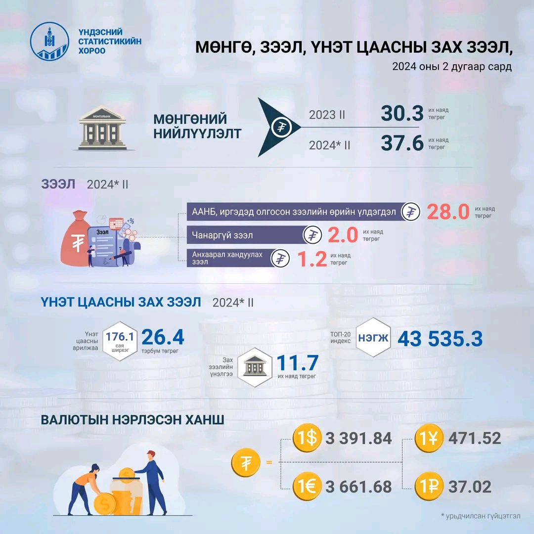 Mөнгөний нийлүүлэлт (M2) энэ оны хоёрдугаар сарын эцэст урьдчилсан гүйцэтгэлээр 37.6 их наяд төгрөг болж, өмнөх оны мөн үеэс 7.3 их наяд төгрөг буюу 24.2%-иар өсчээ.