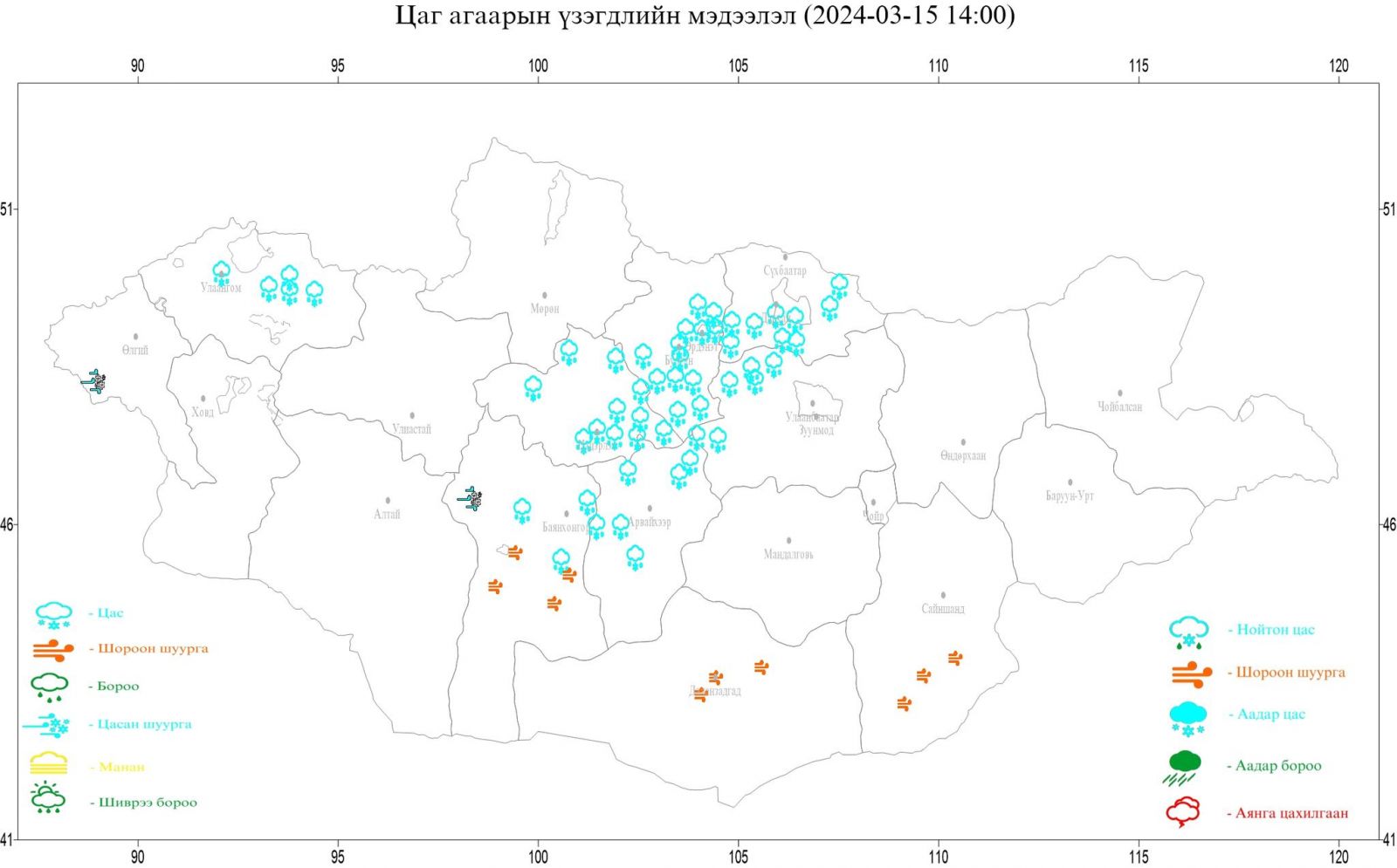 14:00 цагийн байдлаар цаг агаарын үзэгдлийн мэдээлэл: