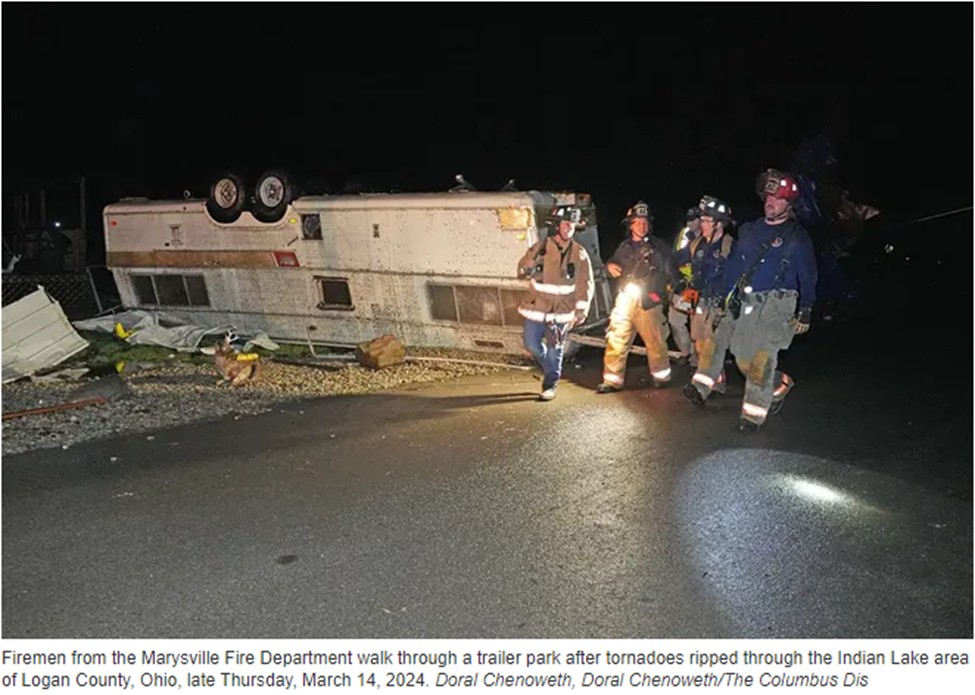 АНУ-ын Охайо мужийн төвийн 11 хотод цаг агаарын аюулт үзэгдлийн улмаас тус мужийн амбан захирагч Майк ДеВайн /2024.03.17/ онц байдал зарлажээ. Учир нь, пүрэв гарагийн шөнө болсон хүчтэй шуурганд Логан мужийн Индиан нуурын хотын орчим гурван хүн амь үрэгдэж, 40 гаруй хүн бэртэж, гэмтсэн ба олон арван барилга байгууламж сүйдсэн байна. Байдал ингээд намжихгүй маш хүчтэй шуурга үргэлжлэх талаар Үндэсний цаг уурын албанаас сэрэмжлүүлэв.