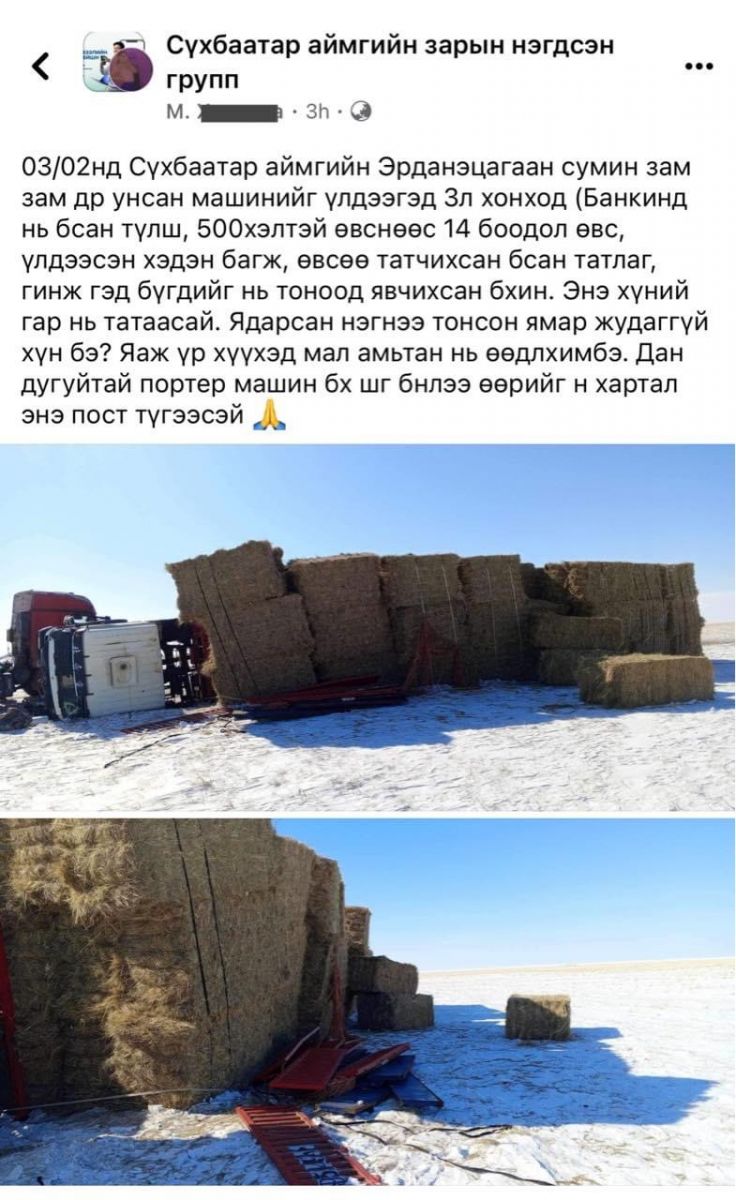 Сүхбаатар аймгийн Эрдэнэцагаан сумын нутагт өвс, тэжээл ачсан машиныг тоносон гэх мэдээлэл олон нийтийн сүлжээнд 2024.03.02-ны өдөр нийтлэгдсэн билээ.