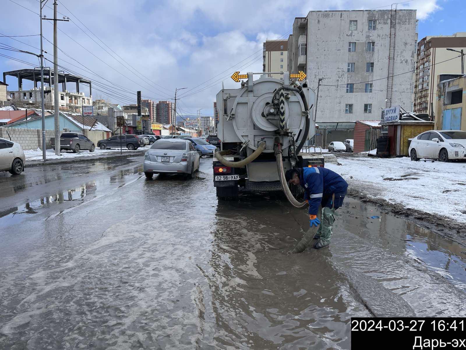- Баянзүрх дүүргийн 29 дүгээр хороо, Дарь-Эхийн замд таван рейсээр 34 тонн усыг тус тус соруулаад байна.