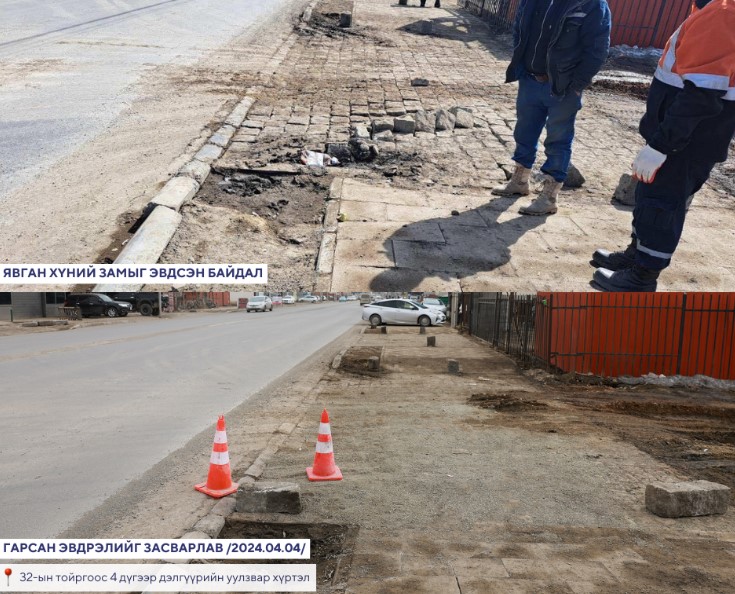 Сүхбаатар дүүргийн 9 дүгээр хороо, 32-ын тойргоос Хүнсний 4-р дэлгүүр хүртэл хийж буй явган хүний замыг эвдсэн гэх мэдээлэл 2024 оны дөрөвдүгээр сарын 1-ний өдөр тус дүүргийн Замын цагдаагийн хэлтэст иржээ. Дуудлага мэдээллийн дагуу уг асуудлыг шалгаж, буруутай этгээдийг тогтоосон бөгөөд том оврын автомашины жолооч бетон зуурмаг тээвэрлэж явахдаа явган хүний зам, хашлагад эвдрэл учруулсан байна.