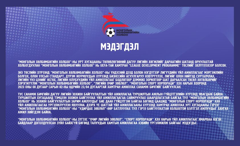 “Монголын Хөлбөмбөгийн Холбоо”-ны Урт Хугацааны Төлөвлөгөөний дагуу лигийн хөгжлийг дараагийн шатанд оруулахтай холбогдуулан “Монголын Хөлбөмбөгийн Холбоо” нь UEFA-тай хамтран “League Development Programme” төслийг эхлүүлэхээр болсон.