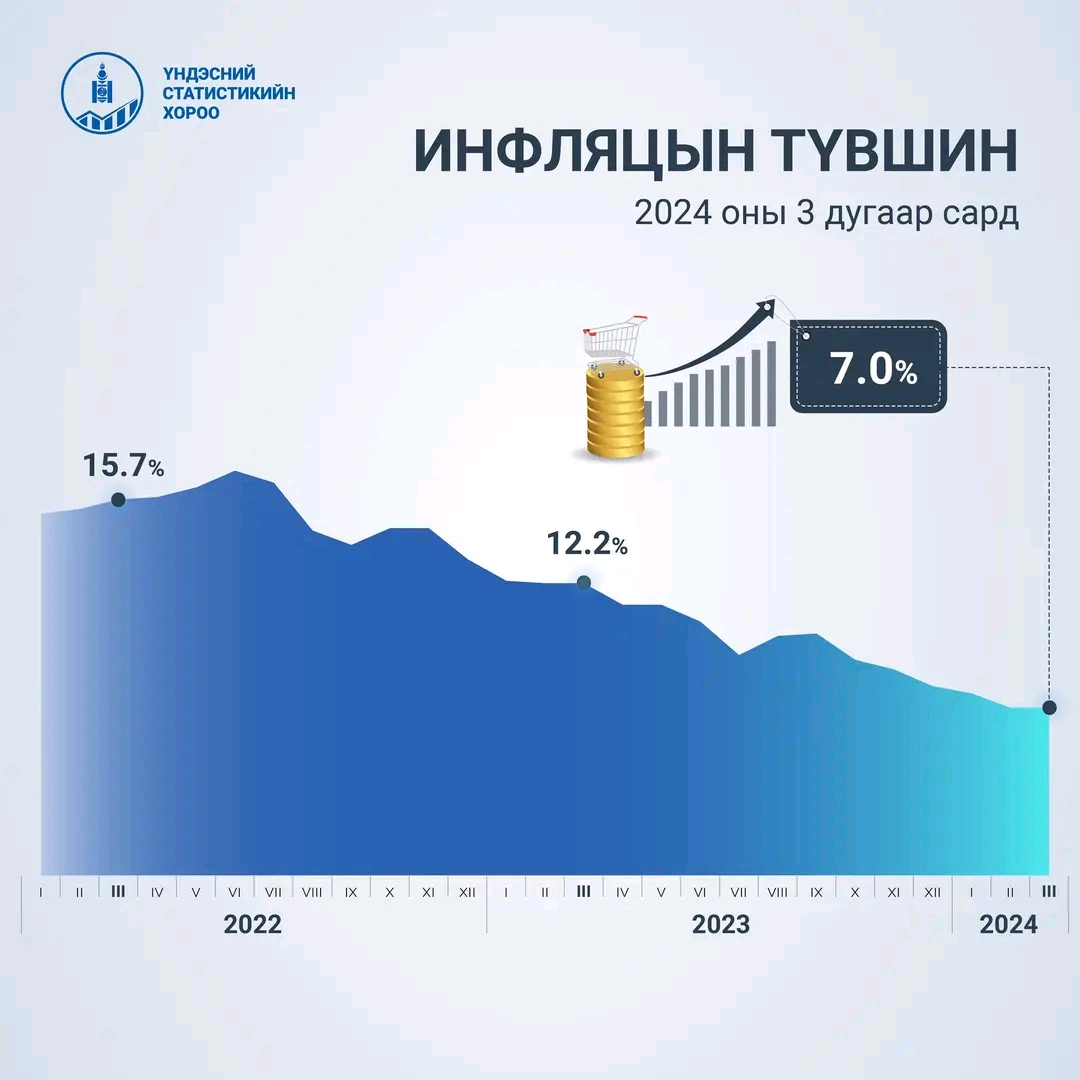 Инфляцын түвшин 2023 оны гуравдугаар сард 12.2 хувь гарсан бол 2024 оны гуравдугаар сард 7.0 хувь болж, өсөлтийн хурдац өмнөх оны мөн үеэс 5.2 нэгж хувиар буурсан байна.