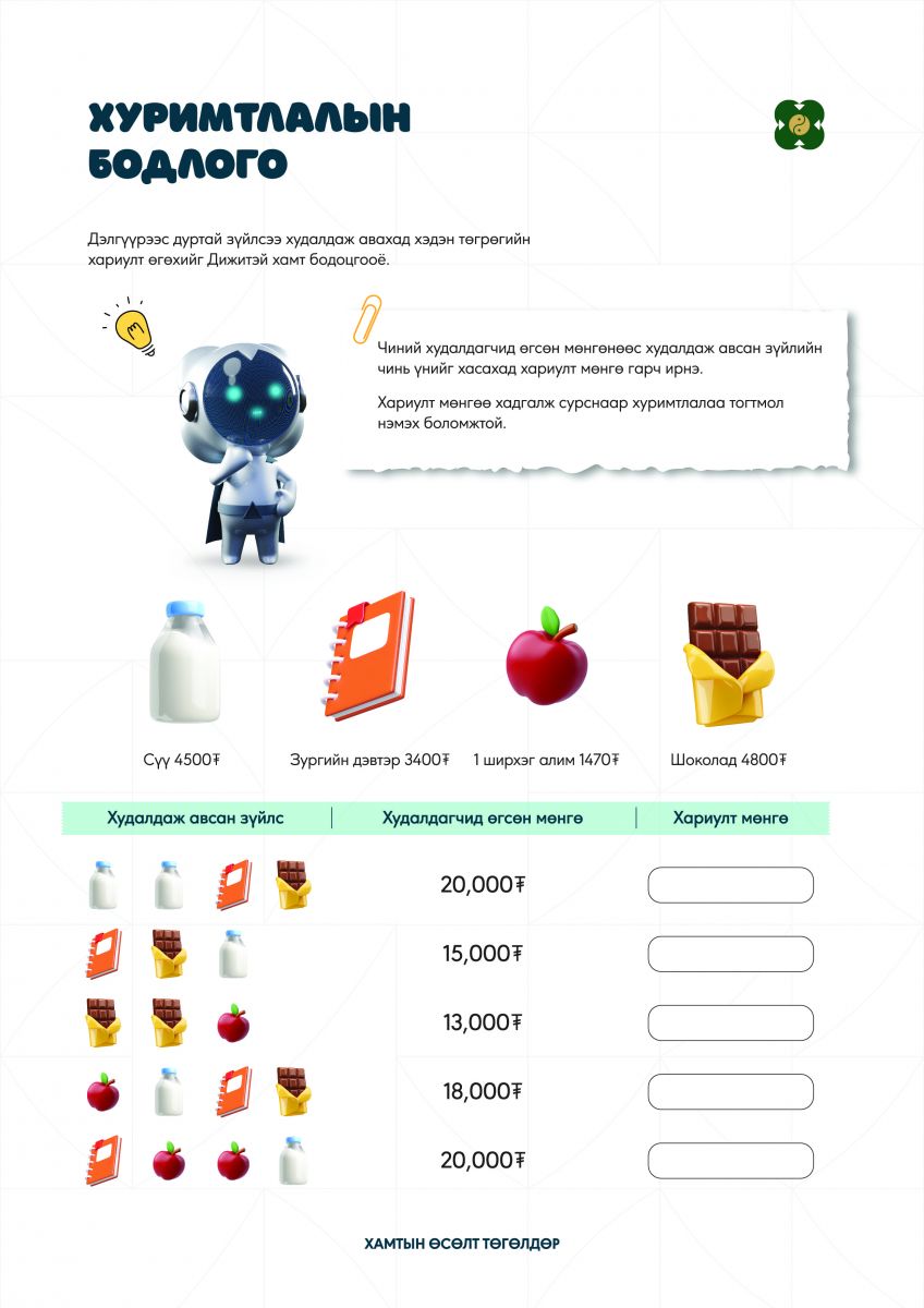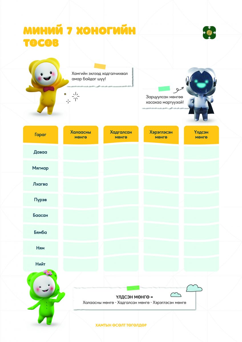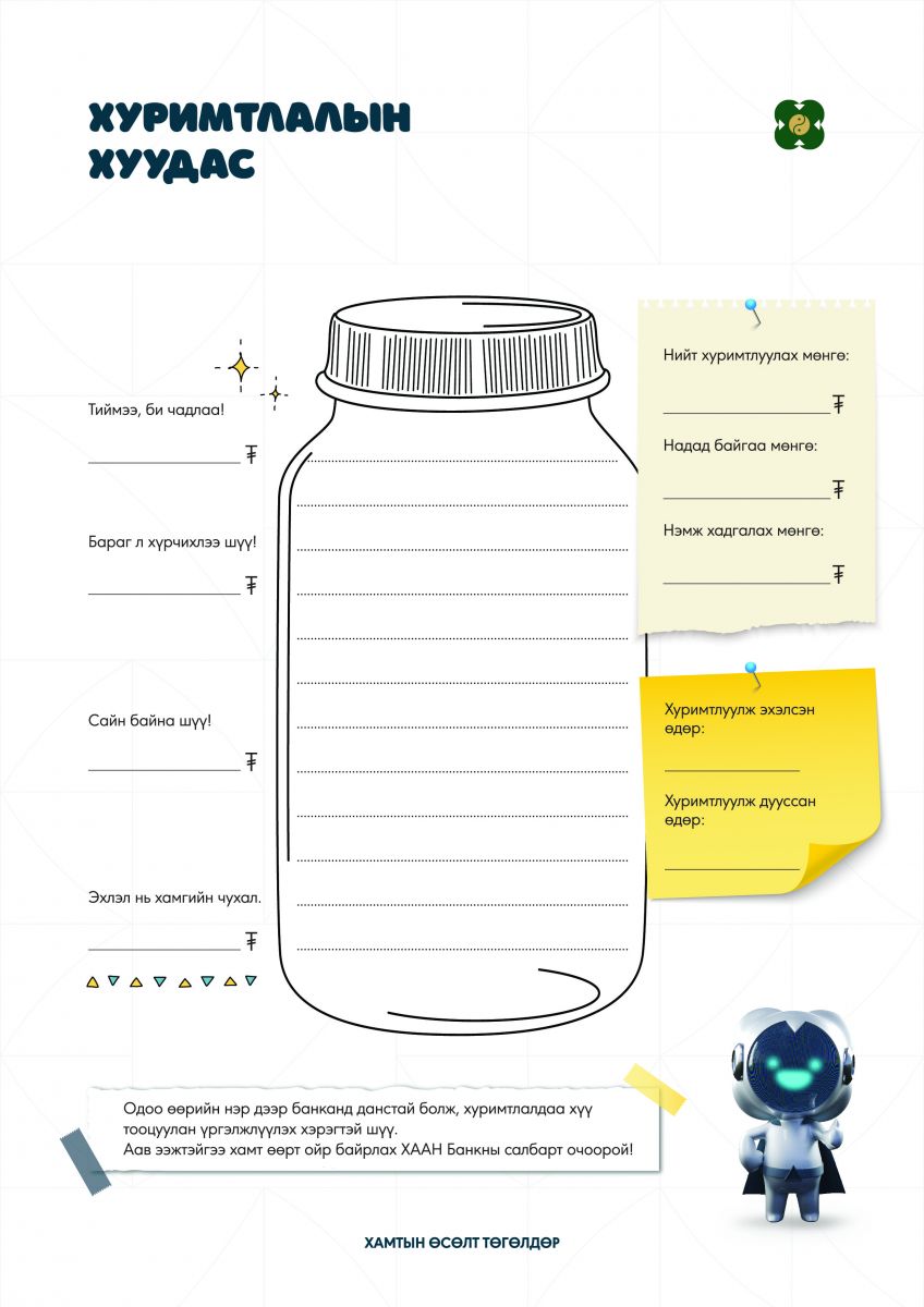 Энэ зорилгын хүрээнд ХААН Банк хүүхэд багачуудад санхүүгийн зөв дадал суулгаж, хуримтлалын ач тусыг ойлгуулахын тулд будах, бөглөх, хөтлөх зориулалт бүхий эдгээр сонирхолтой зурагт хуудсуудыг гаргаад байна.
