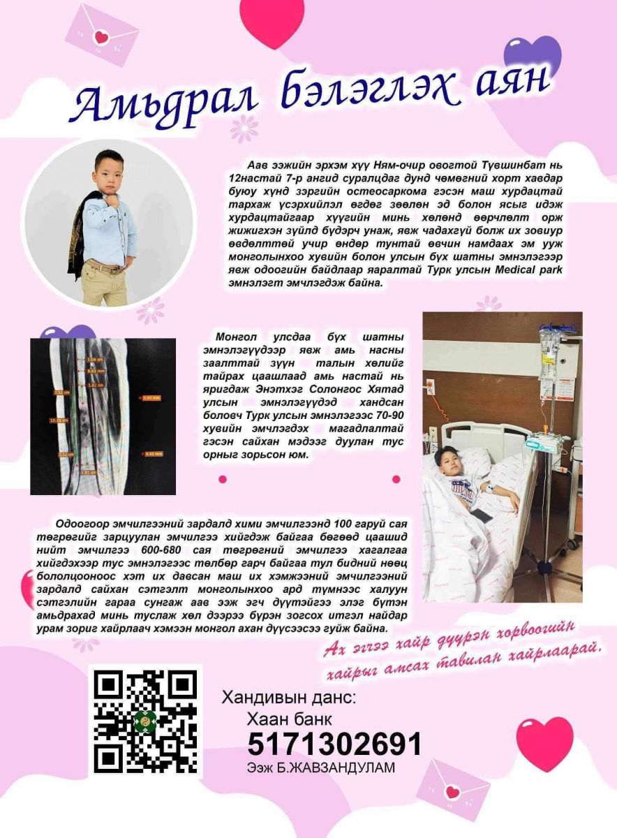 13 настай Н.Түвшинбат хүү Остосерком буюу дунд чөмөгний хүнд хэлбэрийн ясны хорт хавдар оноштойгоор 12 дугаар сараас эхлэн Турк улсад эмчилгээ хийлгэж байна. Хавдрын тархац бууруулах эмчилгээг таван сарын хугацаанд 300 орчим сая төгрөгөөр хийлгэсэн бөгөөд хавдар авах мэс засал энэ сарын 16-ны өдөр товлогдоод байсан юм.