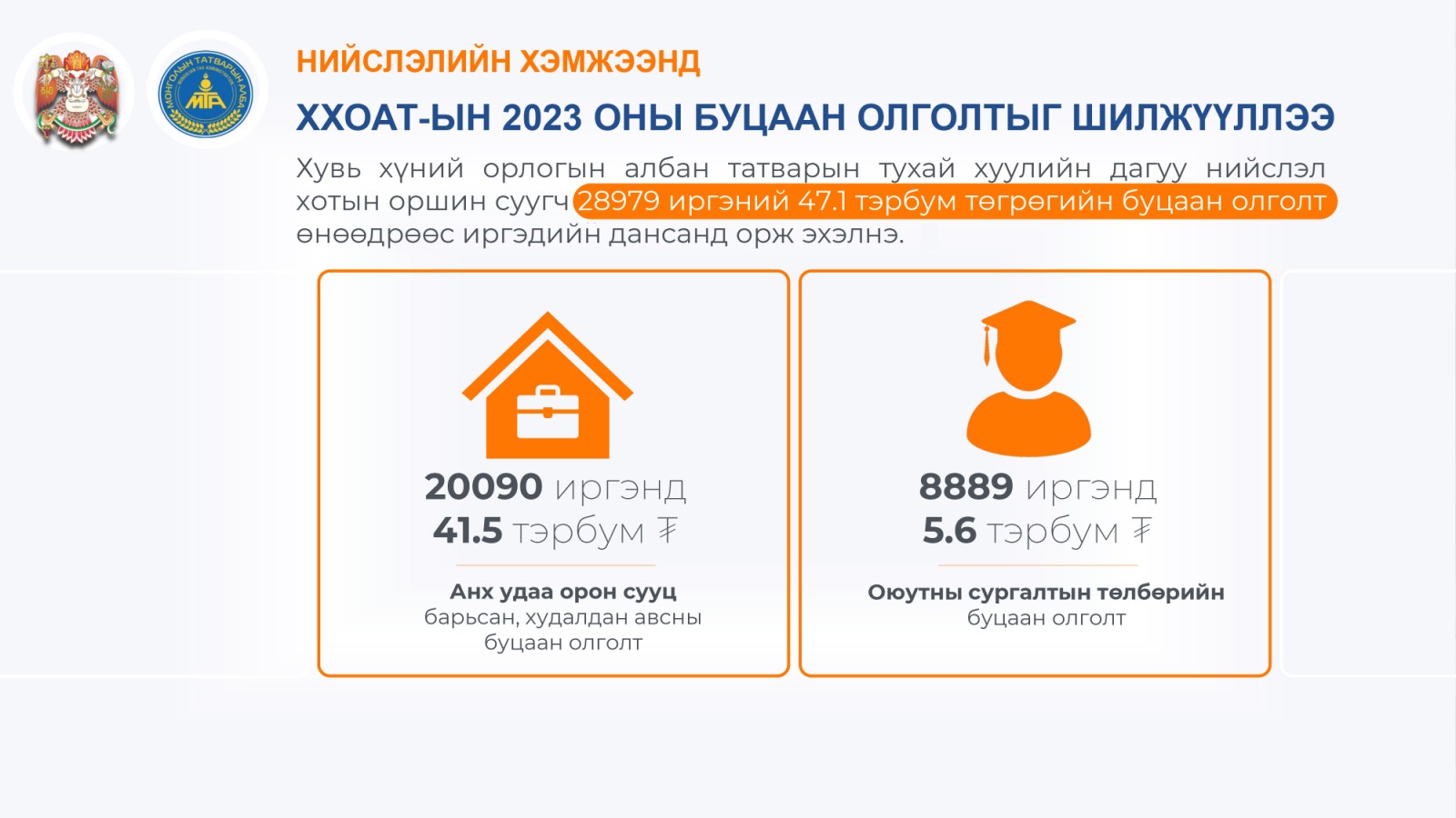 Хувь хүний орлогын албан татварын тухай хуулийн дагуу нийслэл хотын оршин суугч 28,979 иргэний 47.1 тэрбум төгрөгийн буцаан олголт өчигдөр /2024.04.19/ иргэдийн дансанд орж эхэлжээ. Нийслэлийн хэмжээнд 20,090 иргэн орон сууцны буцаан олголтод хамрагдаж, 41.5 тэрбум төгрөгийг буцаан авах бол 8889 иргэн оюутны сургалтын төлбөрийн буцаан олголтод 5.6 тэрбум төгрөг буцаан авах юм байна.