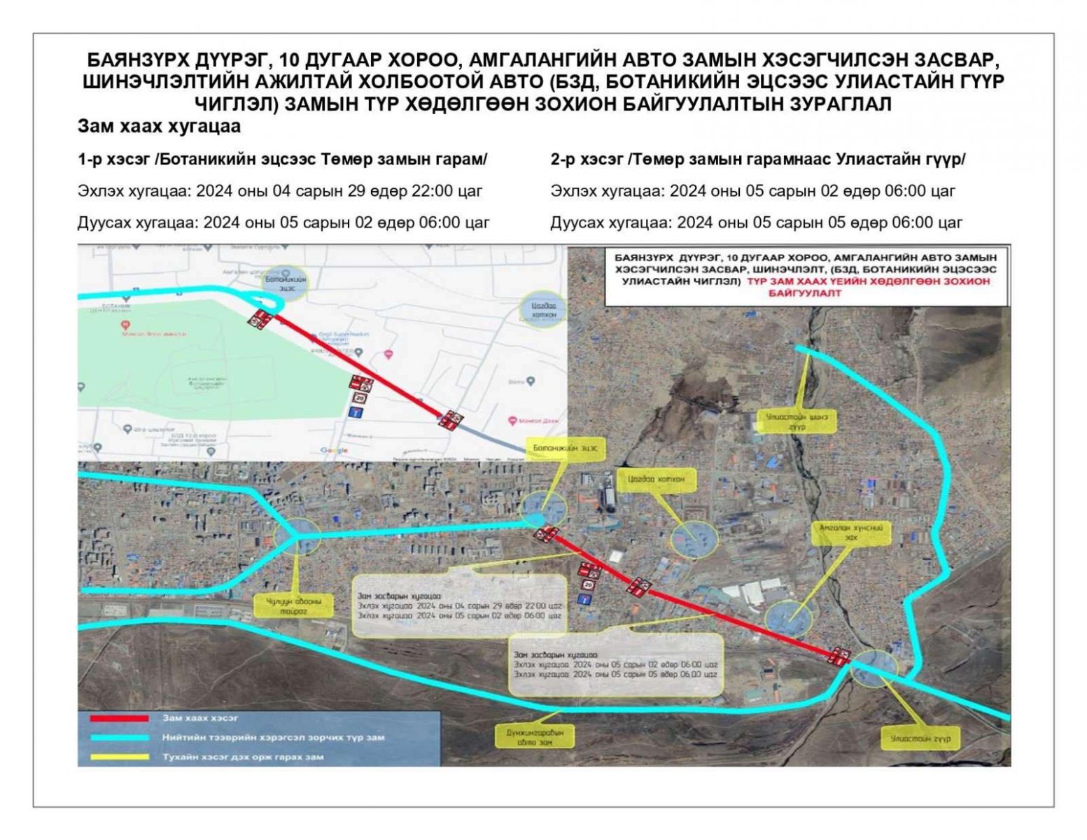 Баянзүрх дүүргийн 10 дугаар хороо, Амгалангийн авто замын хэсэгчилсэн засвар, шинэчлэлтийн ажлын нэгдүгээр хэсэг /Ботаникийн эцсээс Төмөр Замын гарам/ хүртэлх авто замыг дөрөвдүгээр сарын 29-ний өдрийн 22:00 цагаас тавдугаар сарын 2-ны өдрийн 06:00 цагийн хооронд хааж, авто замын хэсэгчилсэн засвар, шинэчлэлтийн ажлыг хийж гүйцэтгэнэ. Тус нэгдүгээр хэсгийн авто замын асфальтбетон хучилт, тэмдэг тэмдэглэгээний ажлыг бүрэн хийж дууссаны дараа хоёрдугаар хэсгийн ажлыг үргэлжлүүлэн хийж эхлэх юм.