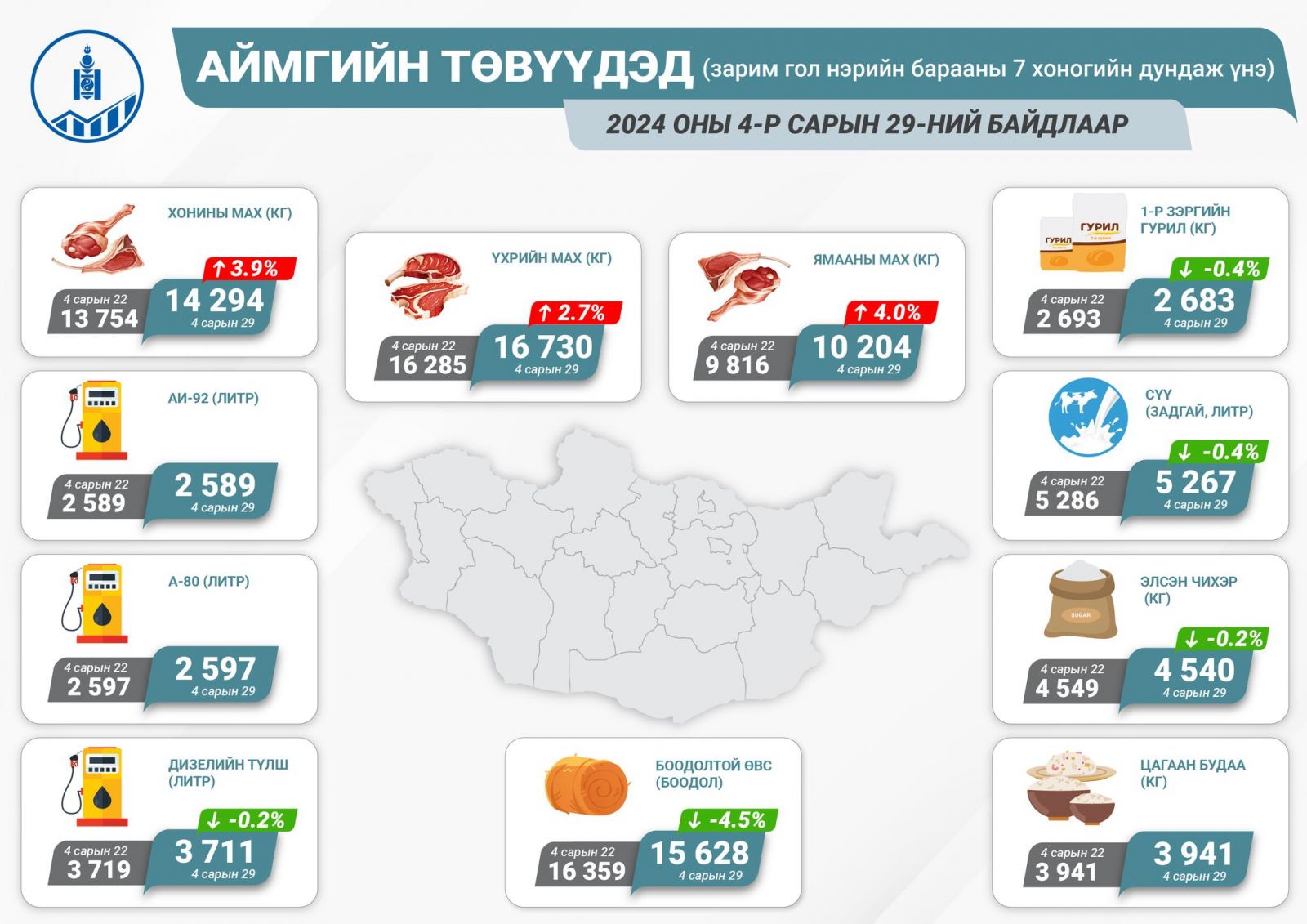 2024 оны 4 дүгээр сарын 29-ний байдлаар аймгийн төвүүдэд зарагдаж байгаа гол нэрийн зарим хүнсний барааны дундаж үнийг танилцуулж байна.