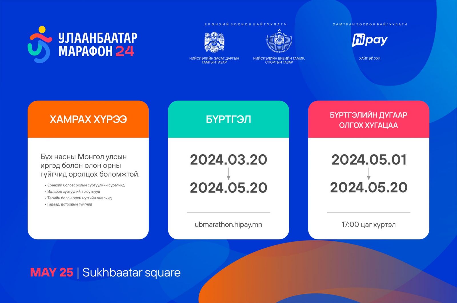 “Улаанбаатар марафон 2024” энэ сарын 25-ны өдөр Д.Сүхбаатарын талбайд болно. Уг олон улсын гүйлтэд оролцогчдын бүртгэл тавдугаар сарын 20-ыг дуустал үргэлжилнэ. Энэ жил гадаадын гүйгчдэд бүртгэлээ хялбар хийх боломжоор хангах зорилгоор олон улсын карт ашиглан төлбөр хийх нөхцөлийг бүрдүүлсэн юм.