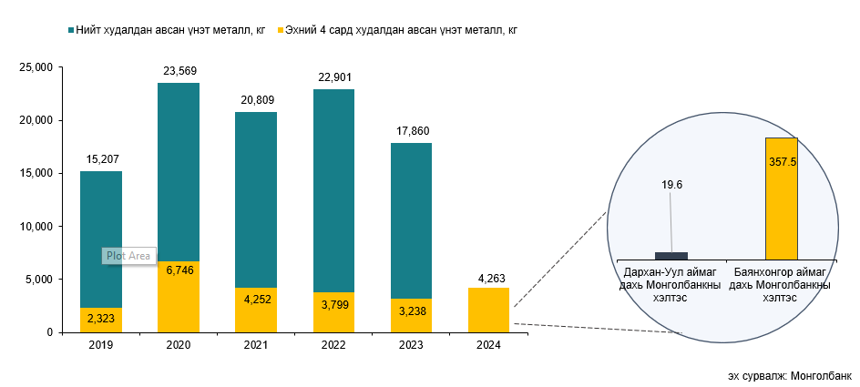 Оны эхнээс өссөн дүнгээр Дархан-Уул аймаг дахь Монголбанкны хэлтэс 19.6 кг, Баянхонгор аймаг дахь Монголбанкны хэлтэс 357.5 кг үнэт металл тус тус худалдан авсан байна.