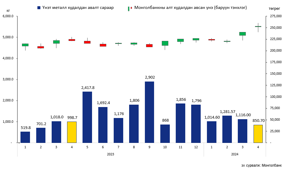 Монголбанк 2024 оны дөрөвдүгээр сард 850,7 кг үнэт металл худалдан авч, оны эхнээс өссөн дүнгээр 4.3 тонн үнэт металл худалдан авчээ.