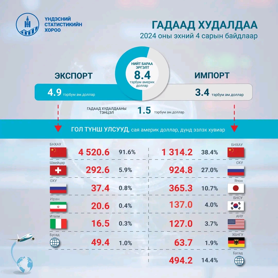 Монгол Улс 2024 оны эхний дөрвөн сард нийт 139 улстай худалдаа хийж, гадаад худалдааны нийт бараа эргэлт 8.4 тэрбум ам.долларт хүрсэн байна.