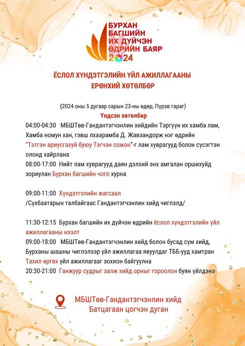 Энэхүү өдөр Төв-Гандантэгчинлэн хийд дараах хөтөлбөрийн дагуу үйл ажиллагаа зохион байгуулна.