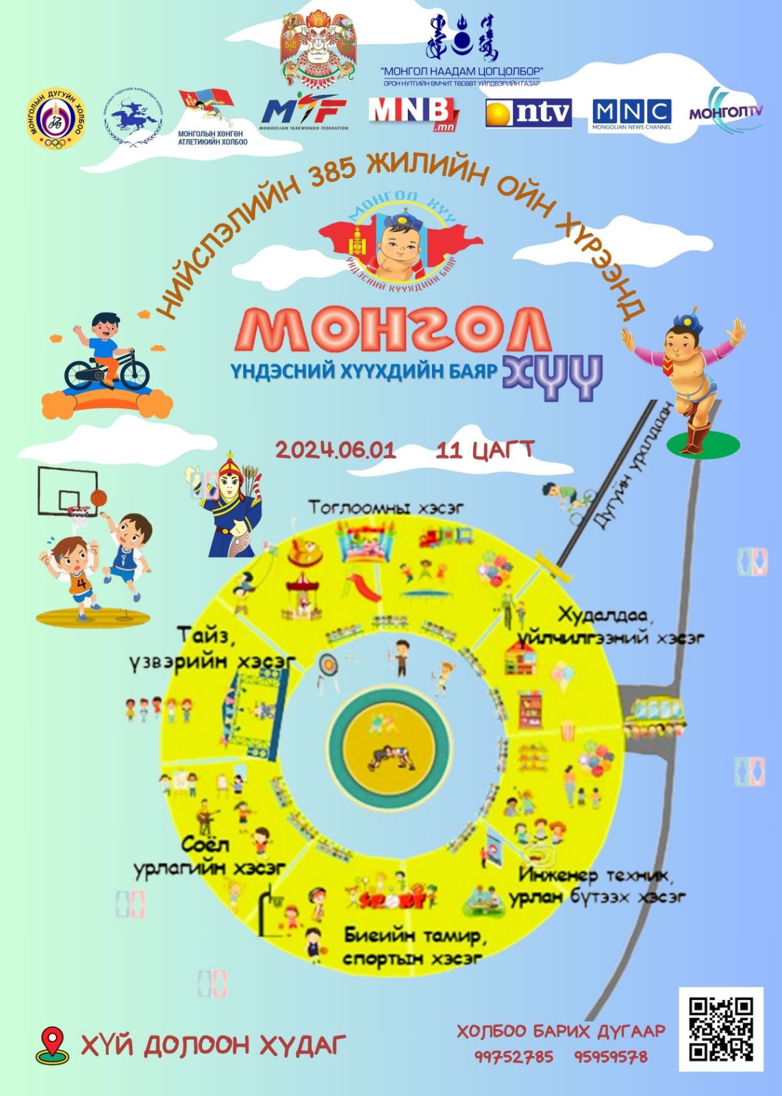 “Монгол хүү” үндэсний хүүхдийн баярын арга хэмжээг Монголын дугуйн холбоо, Монголын үндэсний харваачдын холбоо, Монголын хөнгөн атлетикийн холбоо, Монголын таеквондогийн холбоо, Монголын дрифтын холбоо, Монголын цанын холбоо хамтран зохион байгуулж байгаа бөгөөд үндэсний бөхийн барилдааныг MNC телевизийн Хуйрнан шуугигч нэвтрүүлэгтэй хамтран зохион байгуулна. Мэдээллийн ивээн тэтгэгчээр NTV, МNC, MNB телевиз хамтран ажиллаж байна. Арга хэмжээг 11:00-18:00 цаг цагийн хооронд зохион байгуулна.