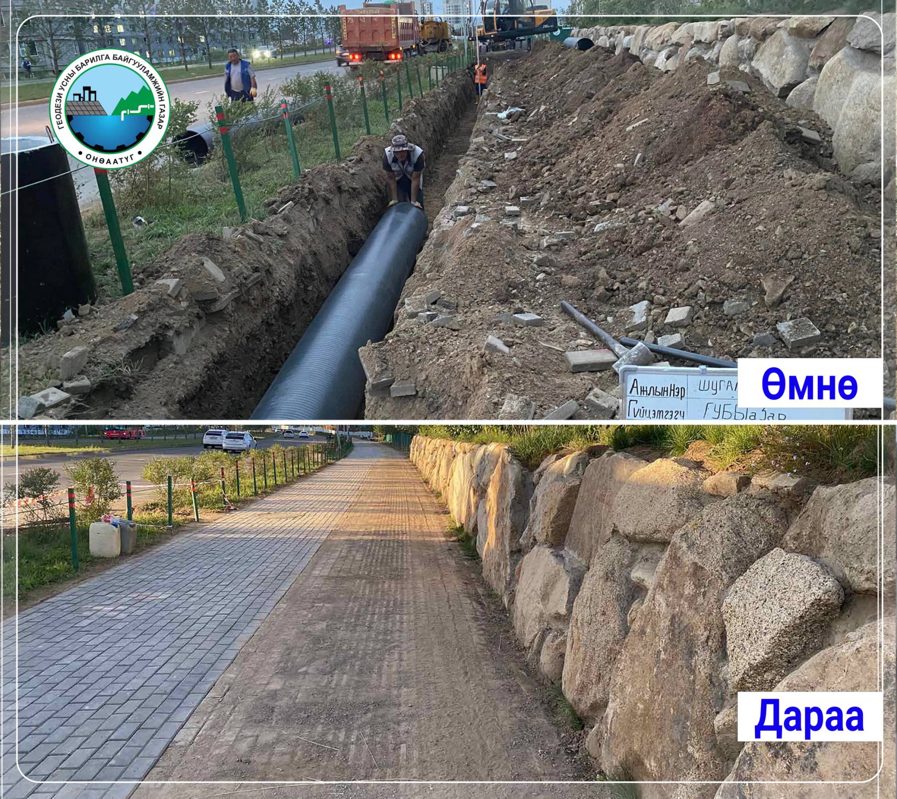 Мөн ус зайлуулах 15 шүүрт худаг, 15 үзлэгийн худгийг угсарч, явган хүний замын нөхөн сэргээлт, сэтэлгээ болон шүүрт худгуудын асфальтаар хучив.