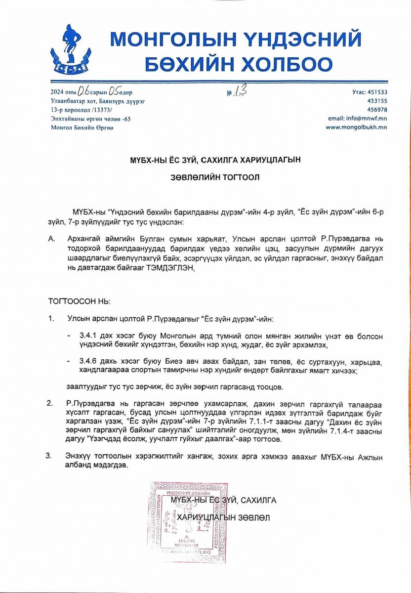 2. Р.Пүрэвдагва нь гаргасан зөрчлөө ухамсарлаж, дахин зөрчил гаргахгүй талаараа хүсэлт гаргасан, бусад улсын цолтнууддаа үлгэрлэн идэвх зүтгэлтэй барилдаж буйг харгалзан үзэж, “Ёс зүйн дүрэм”-ийн 7-р зүйлийн 7.1.1-т заасны дагуу “Дахин ёс зүйн зөрчил гаргахгүй байхыг сануулах” шийтгэлийг оногдуулж, мөн зүйлийн 7.1.4-т заасны дагуу “Үзэгчдэд ёсолж, уучлалт гуйхыг даалгах”-аар тогтоов.
