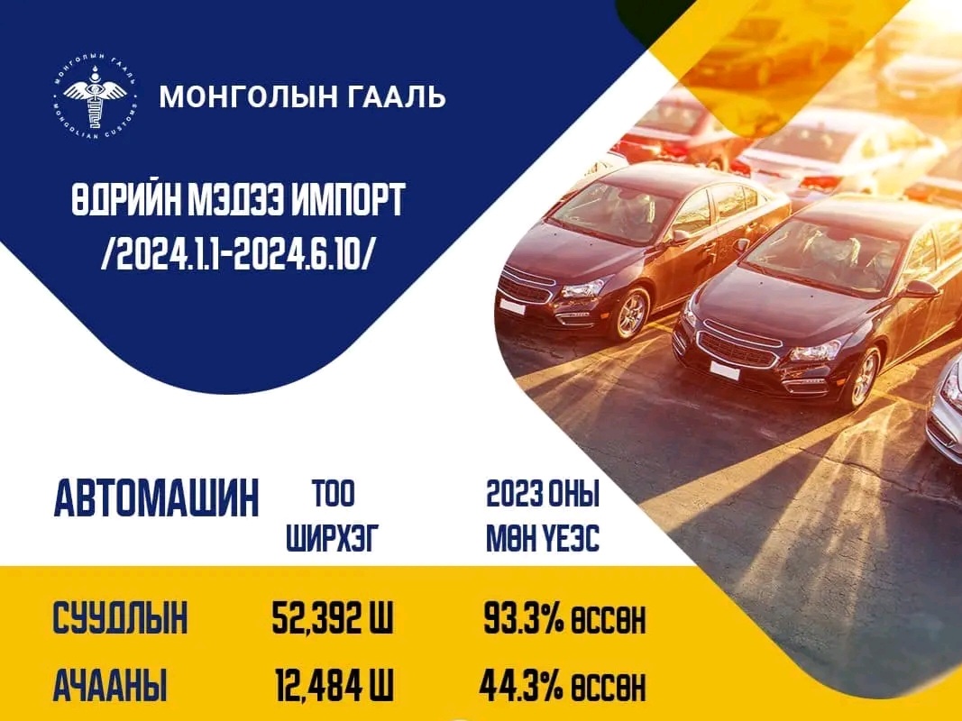 Гаалийн Ерөнхий Газрын мэдээллээр энэ оны нэгдүгээр сарын 1-нээс зургаадугаар сарын 10-ны хооронд 52,392 ширхэг суудлын автомашин импортолжээ.