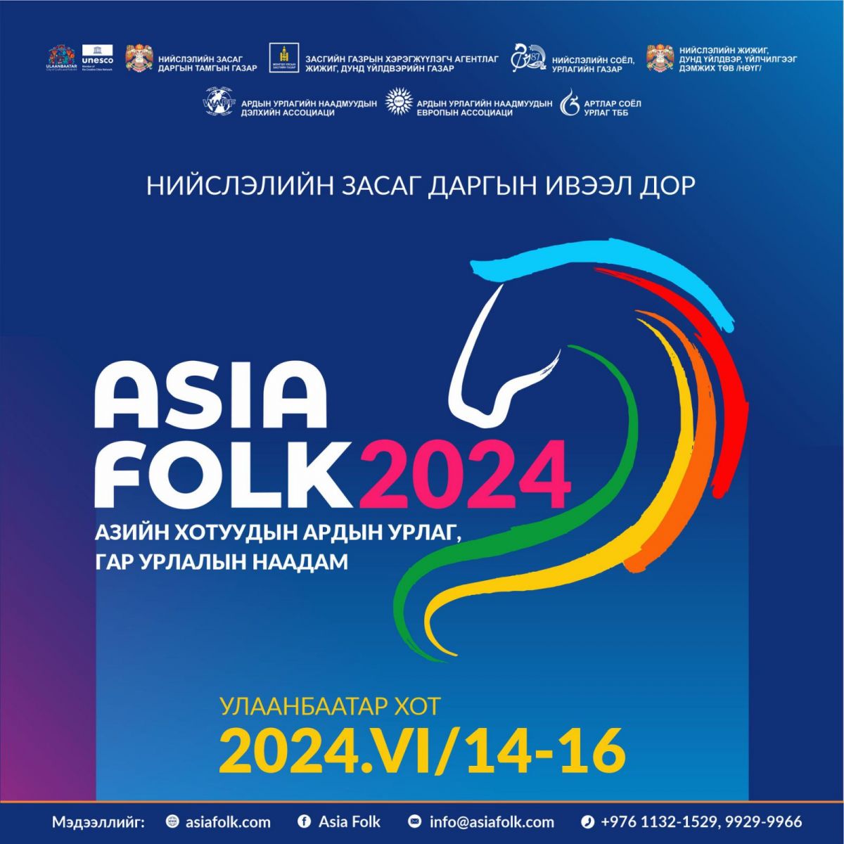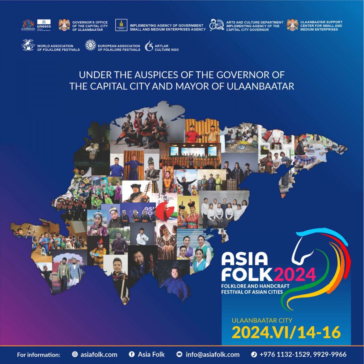 “Asia Folk 2024” Азийн хотуудын ардын урлаг, гар урлалын наадам Нийслэлийн Засаг дарга бөгөөд Улаанбаатар хотын захирагчийн ивээл дор 2024 оны 06-р сарын 14-16-ны өдрүүдэд Улаанбаатар хотноо зохион байгуулагдах гэж байна.