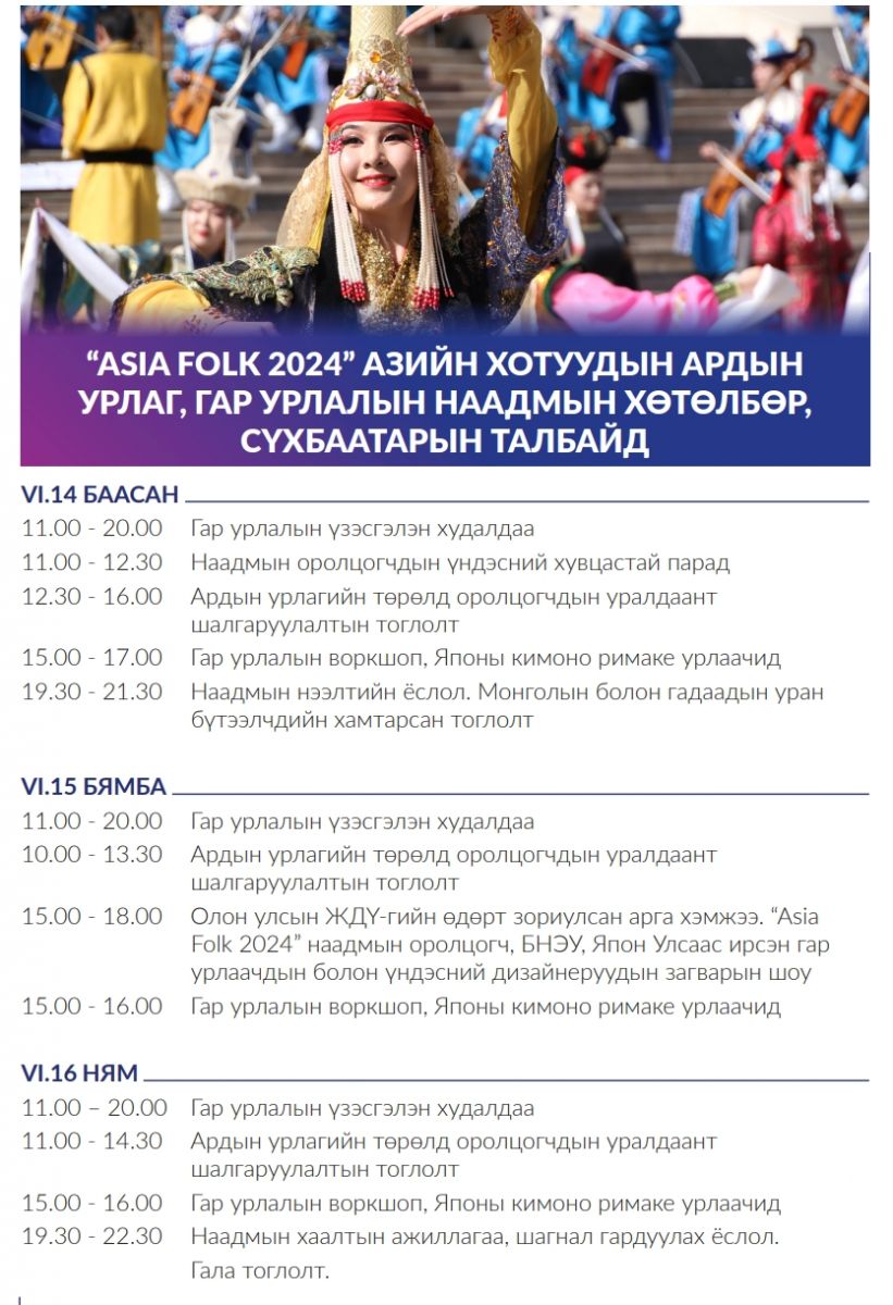 Нийслэлийн Засаг дарга бөгөөд Улаанбаатар хотын захирагчийн ивээл дор Азийн хотуудын ардын урлаг, гар урлалын “Asia Folk 2024” наадам өнөөдөр 19:40 цагт жанжин Д.Сүхбаатартын талбайд албан ёсны нээлтээ хийх гэж байна. Харин 11:40 цагт энэхүү наадамд оролцож байгаа Азийн хотуудын оролцогчдын парад болно.