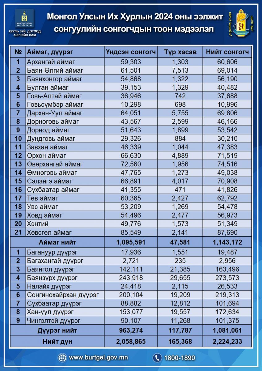 Монгол Улсын Их Хурлын 2024 оны ээлжит сонгуулиар санал өгөх нийт 2,224,233 сонгогч байгаагаас үндсэн 2,058,865 сонгогч, “Түр хасав” тэмдэглэгээтэй 165,368 сонгогч бүртгэгдсэн байна.