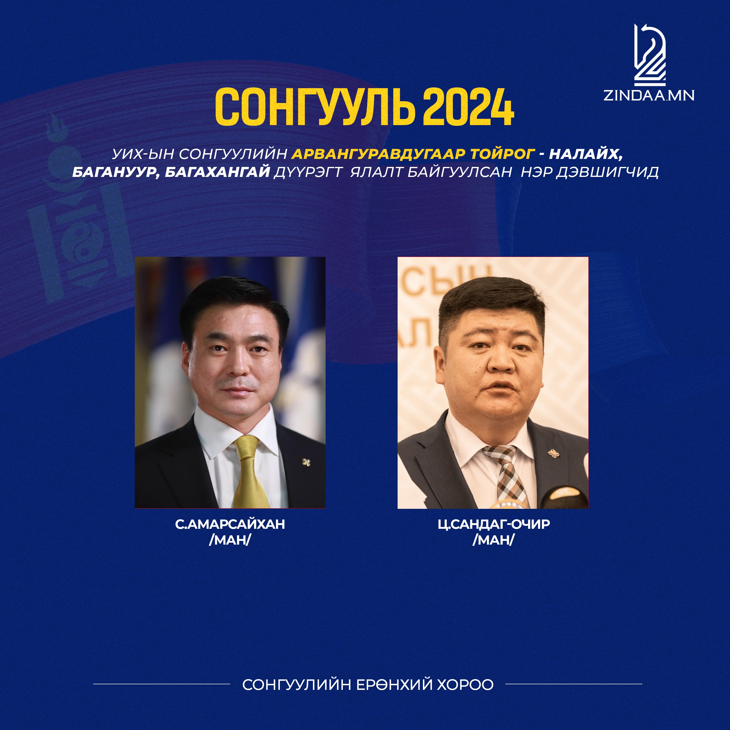 УИХ-ын сонгуулийн арвангуравдугаар тойрог буюу Налайх, Багануур, Багахангай дүүрэгт МАН-аас нэр дэвшигч Сайнбуянгийн Амарсайхан, Цэндийн Сандаг-Очир нар хамгийн их санал авлаа.