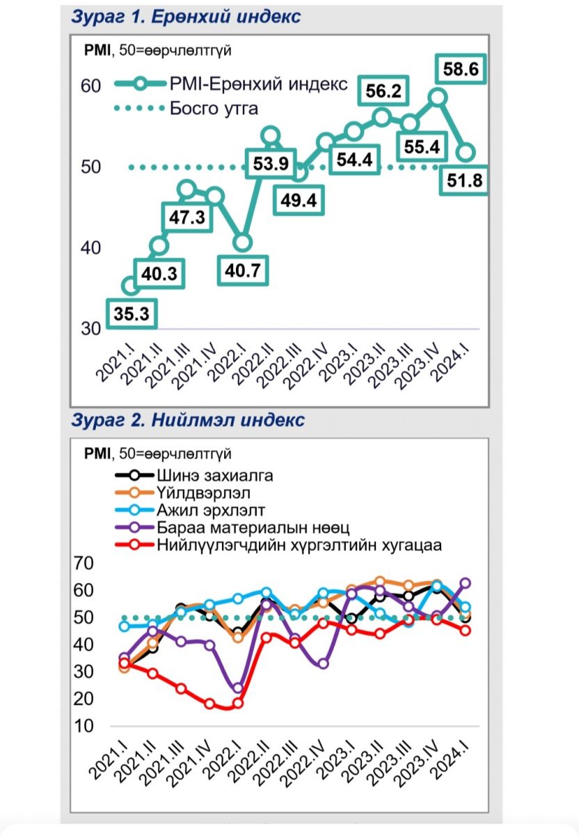 2024 оны нэгдүгээр улирлын үйлдвэрлэлийн индексийн утга 51.7%-тай гарсан бөгөөд энэ улиралд эдийн засаг өсөлттэй гарчээ.