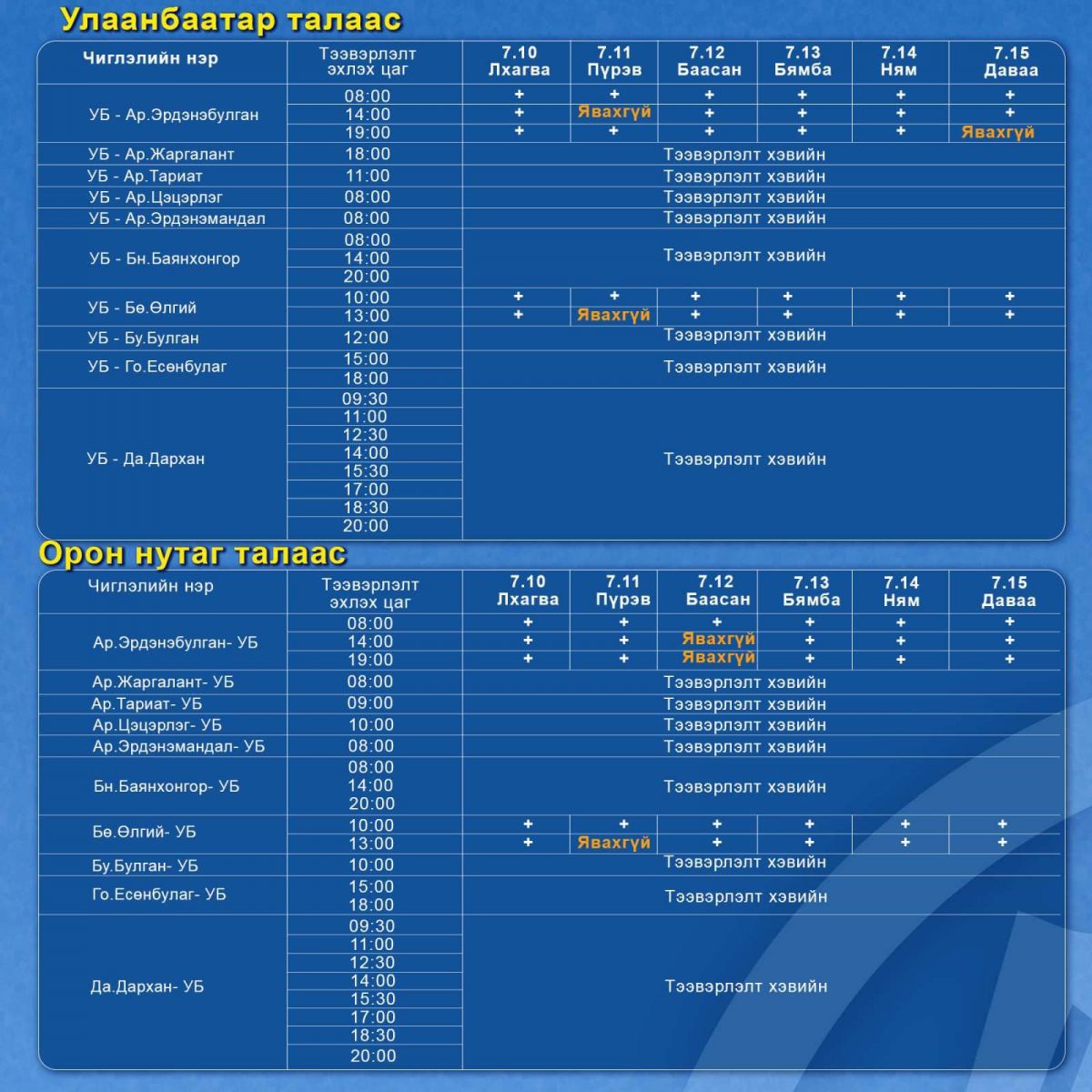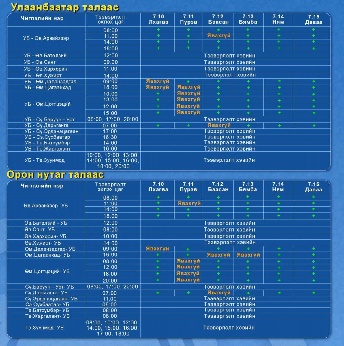 Авто тээврийн үндэсний төвөөс баяр наадмын үеэр буюу 7 сарын 10-15-ны өдрийн хооронд хот хоорондын зорчигч тээвэрлэлт гүйцэтгэх цагийн хуваарийг танилцууллаа.