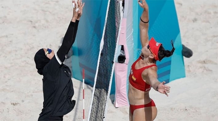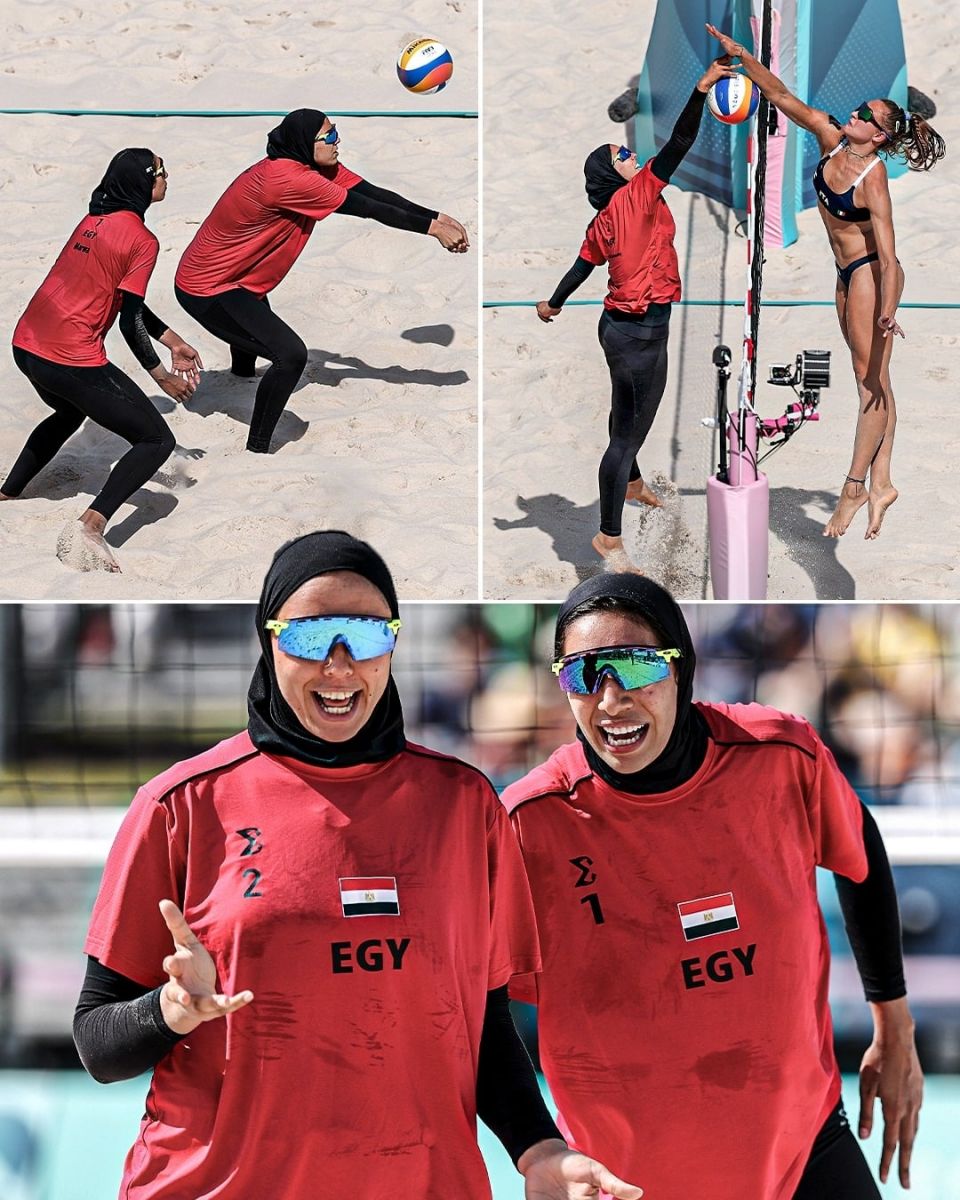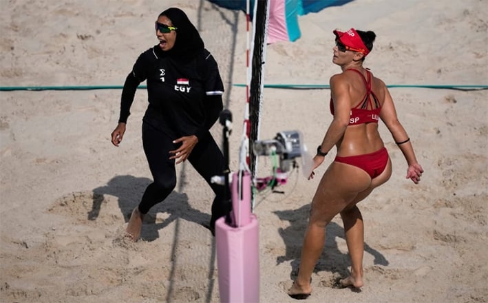 Пүрэв гаригт олимпын элсний волейболын эмэгтэйчүүдийн тэмцээнд Испани – Египетийн баг тааран тоглолоо. Хэн ч харсан хоёр багийн тамирчдын хувцас тэс өөр байв. Испанийн Лилиана Штайнер, Паула Гутьеррес нар бикинитэй, харин Египетийн Марва Абдельхада, Доа Эльхобаши нар хижабтай.