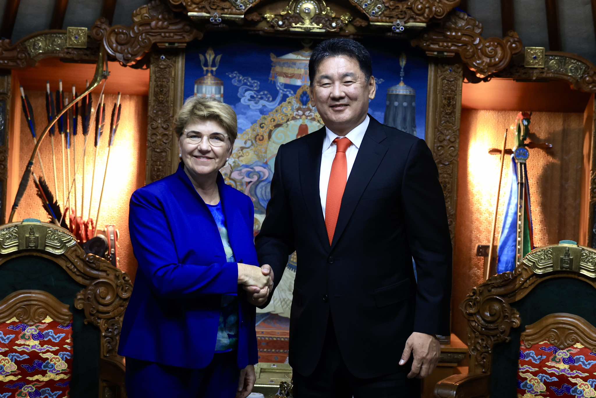 Монгол Улсын Ерөнхийлөгч У.Хүрэлсүх, Швейцарын Холбооны Улсын Ерөнхийлөгч Виола Амхерд нар Төрийн ордонд албан ёсны уулзалт хийлээ.