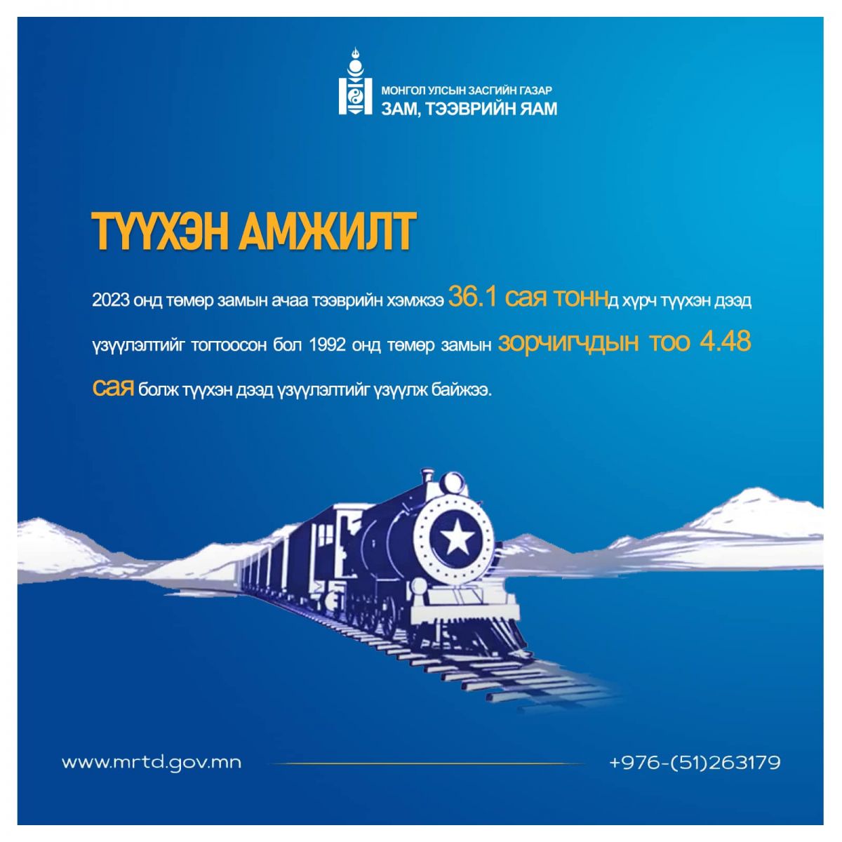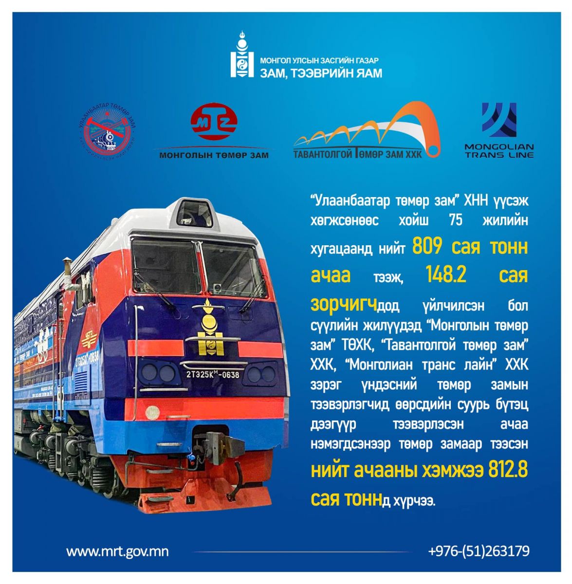 “Улаанбаатар төмөр зам” ХНН үүсэж хөгжсөнөөс хойш 75 жилийн хугацаанд нийт 809 сая тонн ачаа тээж, 148.2 сая зорчигчдод үйлчилсэн бол сүүлийн жилүүдэд “Монголын төмөр зам” ТӨХК, “Тавантолгой төмөр зам” ХХК, “Монголиан транс лайн” ХХК зэрэг үндэсний төмөр замын тээвэрлэгчид өөрсдийн суурь бүтэц дээгүүр тээвэрлэсэн ачаа нэмэгдсэнээр төмөр замаар тээсэн нийт ачааны хэмжээ 812.8 сая тоннд хүрчээ.