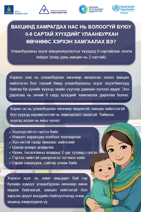 Хэрвээ эцэг эх, хамт амьдарч буй гэр бүлийн хүмүүс улаанбурхан өвчнөөр өмнө өвдөж байгаагүй, вакцин хийгээгүй бол харъяа эрүүл мэндийн байгууллагад очиж вакцинд хамрагдана уу.