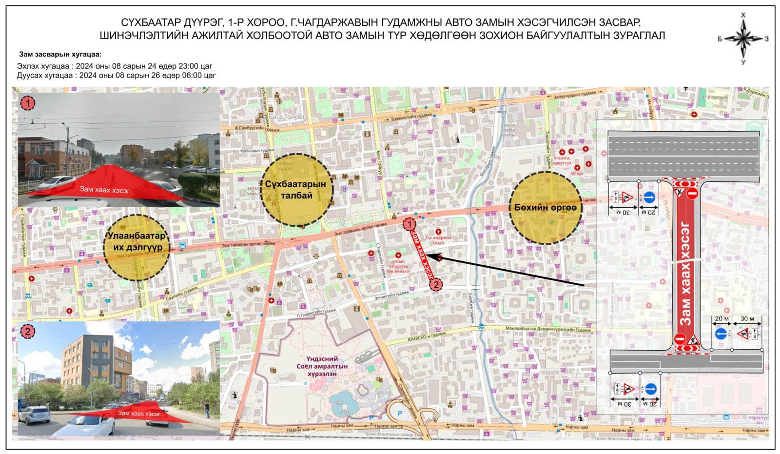 СБД-ийн 1 дүгээр хороо, Г.Чагдаржавын гудамж буюу Энхтайваны өргөн чөлөөнөөс Элчингийн гудамж хүртэл авто замыг наймдугаар сарын 24-ний өдрийн 23:00 цагаас 26-ны өдрийн 06:00 цагийн хооронд хааж, шинэчилнэ.