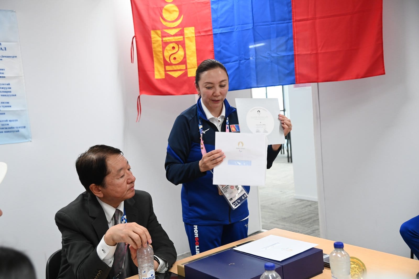 Энэ үеэр Монгол Улсын багийн ахлагч, БТСУХ-ны Гадаад харилцаа, мэдээллийн технологийн хэлтсийн дарга, Азийн Паралимпын хорооны тэмцээн, наадам, спортын хөгжлийн хорооны дарга Н.Оюунбат медаль хүртсэн тамирчдад Паралимпын наадмын медальтны энгэрийн тэмдэг болон медалийн гэр, Паралимпын наадмын зурагт хуудсыг гардуулан өглөө.