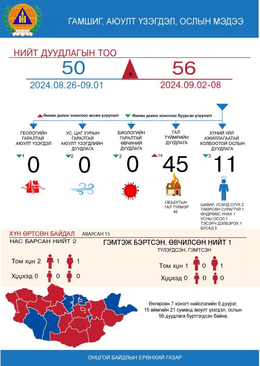 Улсын хэмжээнд өнгөрсөн долоо хоногт /2024.09.02-08/ нийслэлийн 6 дүүрэг, 15 аймгийн 21 суманд аюулт үзэгдэл, ослын 56 удаагийн дуудлага бүртгэгдсэн байна.