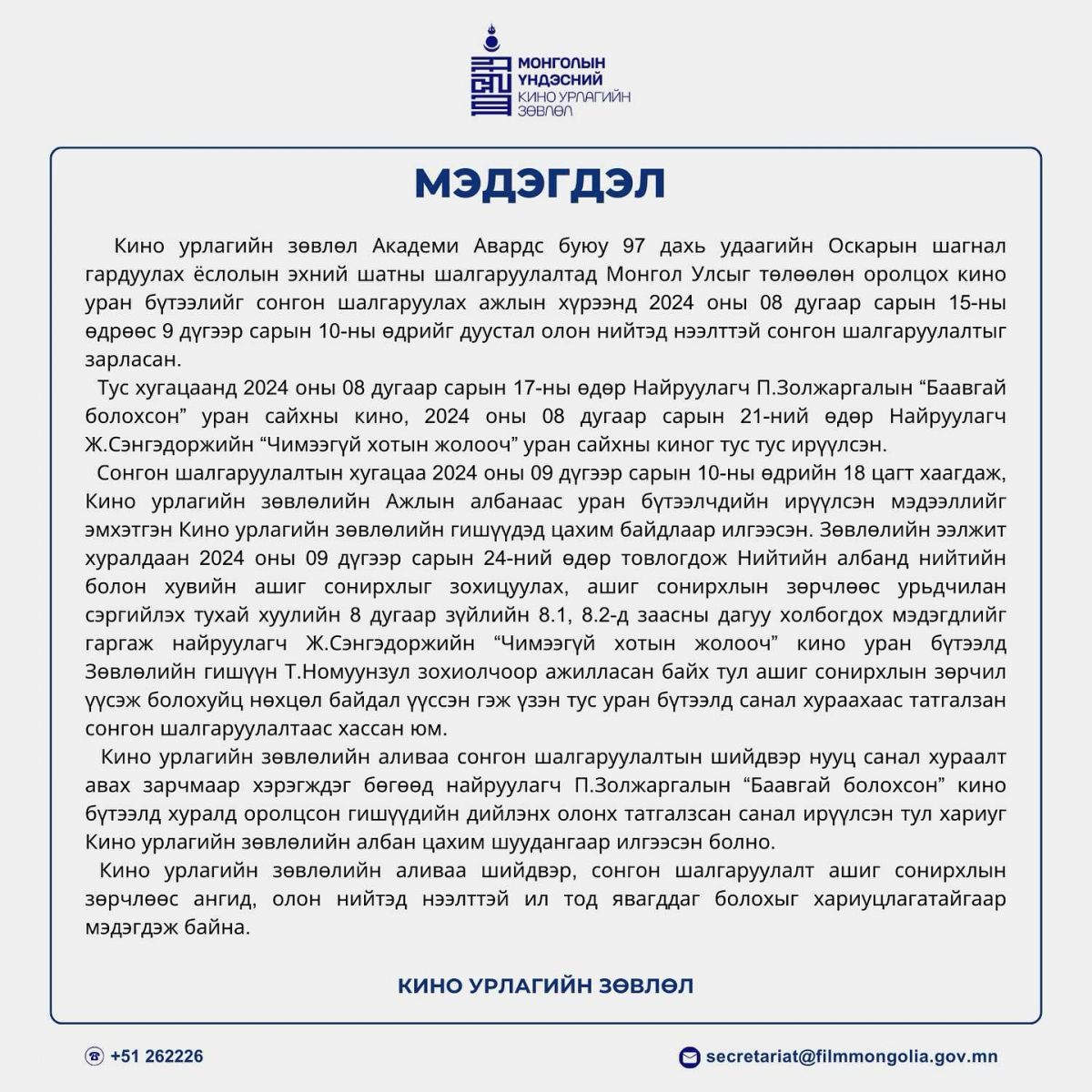 97 дахь удаагийн Оскарын шагнал гардуулах ёслолын урьдчилсан шатны шалгаруулалтад Монгол Улсыг төлөөлөн оролцох кино бүтээлийг сонгох ажлыг Соёлын яамны дэргэдэх Кино урлагийн зөвлөл (КУЗ) хариуцан ажилладаг. Тус зөвлөл энэ жил Оскарын шагнал гардуулах ёслолд эх орноо төлөөлсөн бүтээл илгээхгүй байхаар шийдвэрлэсэн бөгөөд уг шийдвэр нь олон нийтээс шүүмжлэл хүртээд байна.