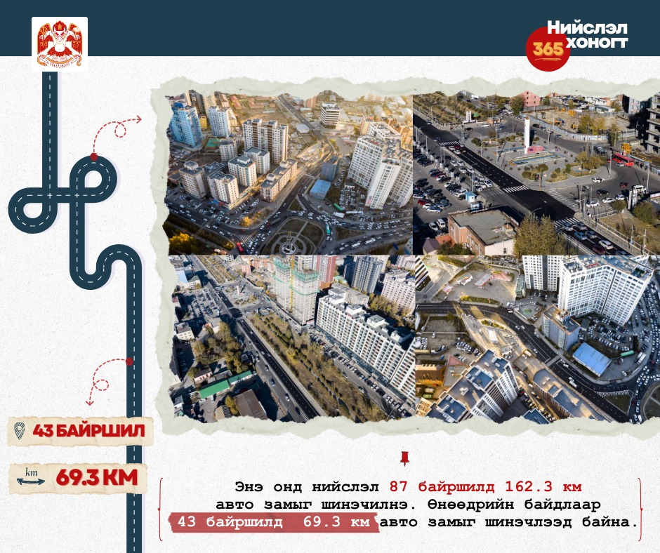 Тодруулбал, нийслэлийн гол гудамж замуудыг өргөтгөх, хуучин замуудыг засварлах ажлын хүрээнд 43 авто замыг шинэчилж дууслаа. 2024 онд шинэчлэх авто замууд нь сүүлийн 10 жилд шинэчилсэн авто замын дундажтай харьцуулахад 10 дахин урт байгаа юм. Тухайлбал, 2021 онд нийт 14 байршилд 12.9 км, 2022 онд 12 байршилд 15 км, 2023 онд 13 байршилд 18.5 км урт замыг шинэчилжээ.